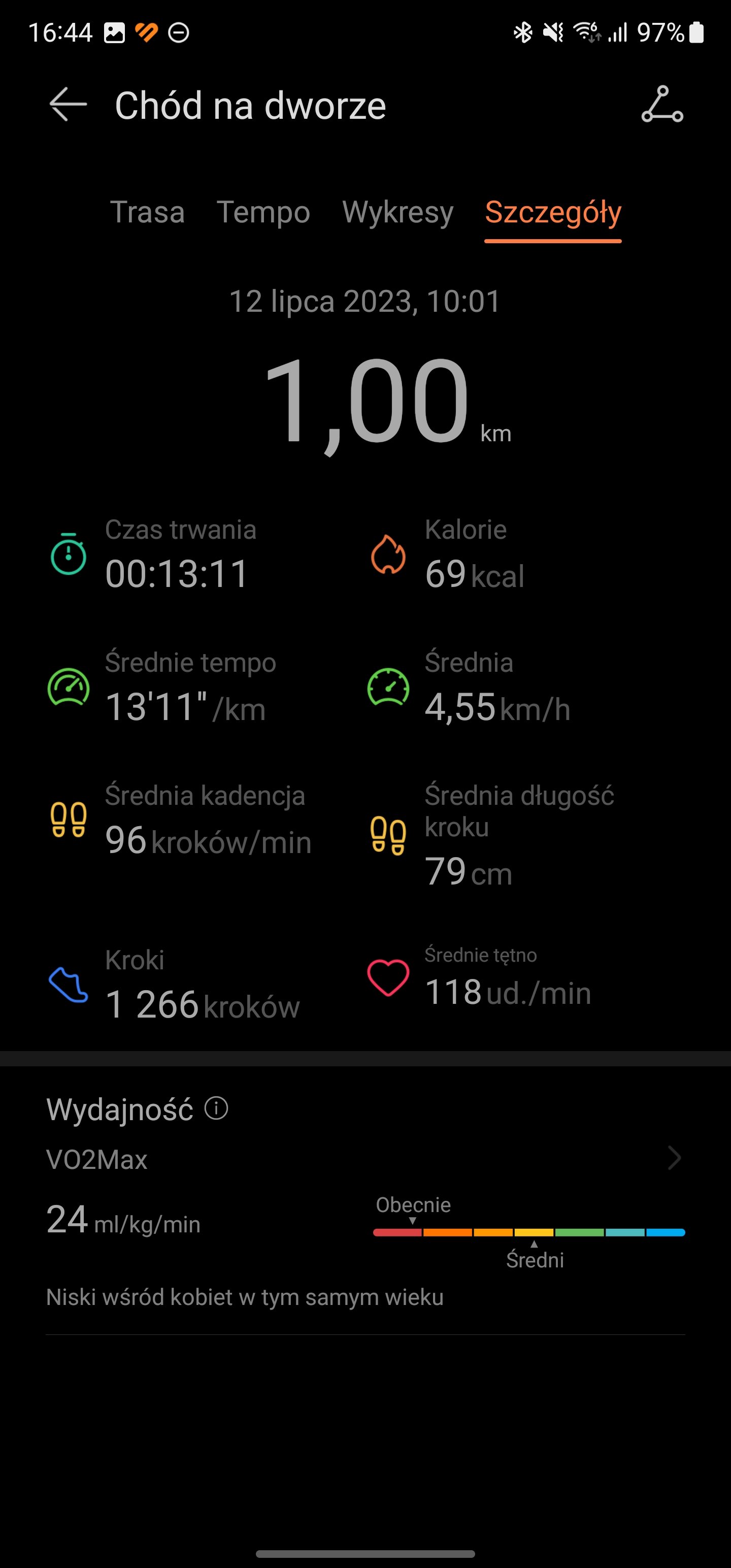 Dziwnie – to chyba najlepsze określenie. W jednym przypadku opaska i zegarek pokazały przejście kilometra, podczas gdy Strava zarejestrowała 1,06 km. W drugim przypadku rozbieżności były większe – Strava: 0,97 km, zegarek: 1,03 km, opaska: 1 km. Wciąż jednak są to wyniki z różnicą w granicach rozsądku.