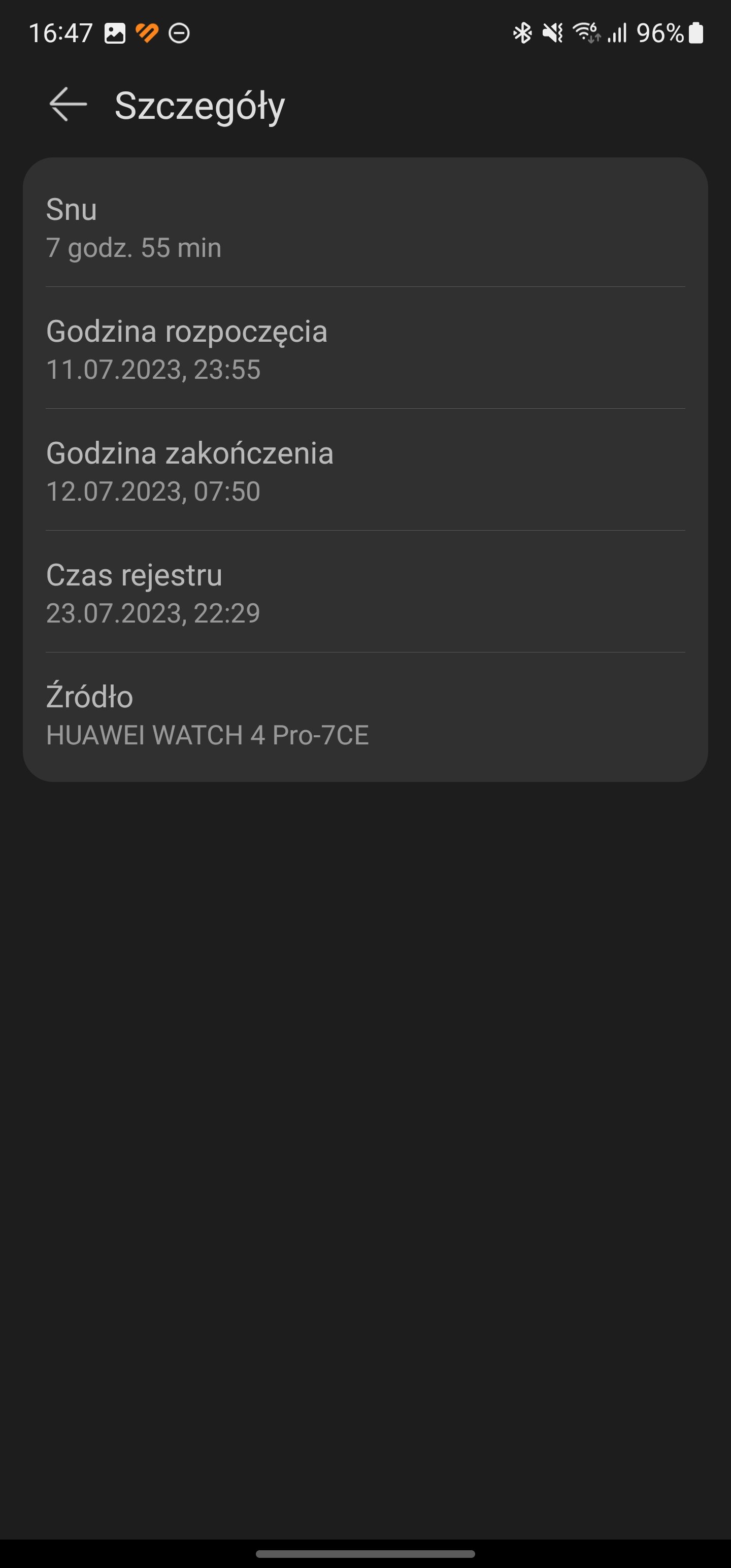 Kilkukrotnie poszłam spać mając założone na nadgarstkach oba wspomniane urządzenia – testową opaskę i najnowszy zegarek. I wiecie co? Z pomiarów wynika, że smartwatch jest jakby bardziej wrażliwy – moment położenia się rejestruje często jako czas zaśnięcia. Tymczasem opaska w większości przypadków pokazuje nieco późniejsze rozpoczęcie monitorowania snu, co w zdecydowanej większości pokrywałoby się ze stanem faktycznym.