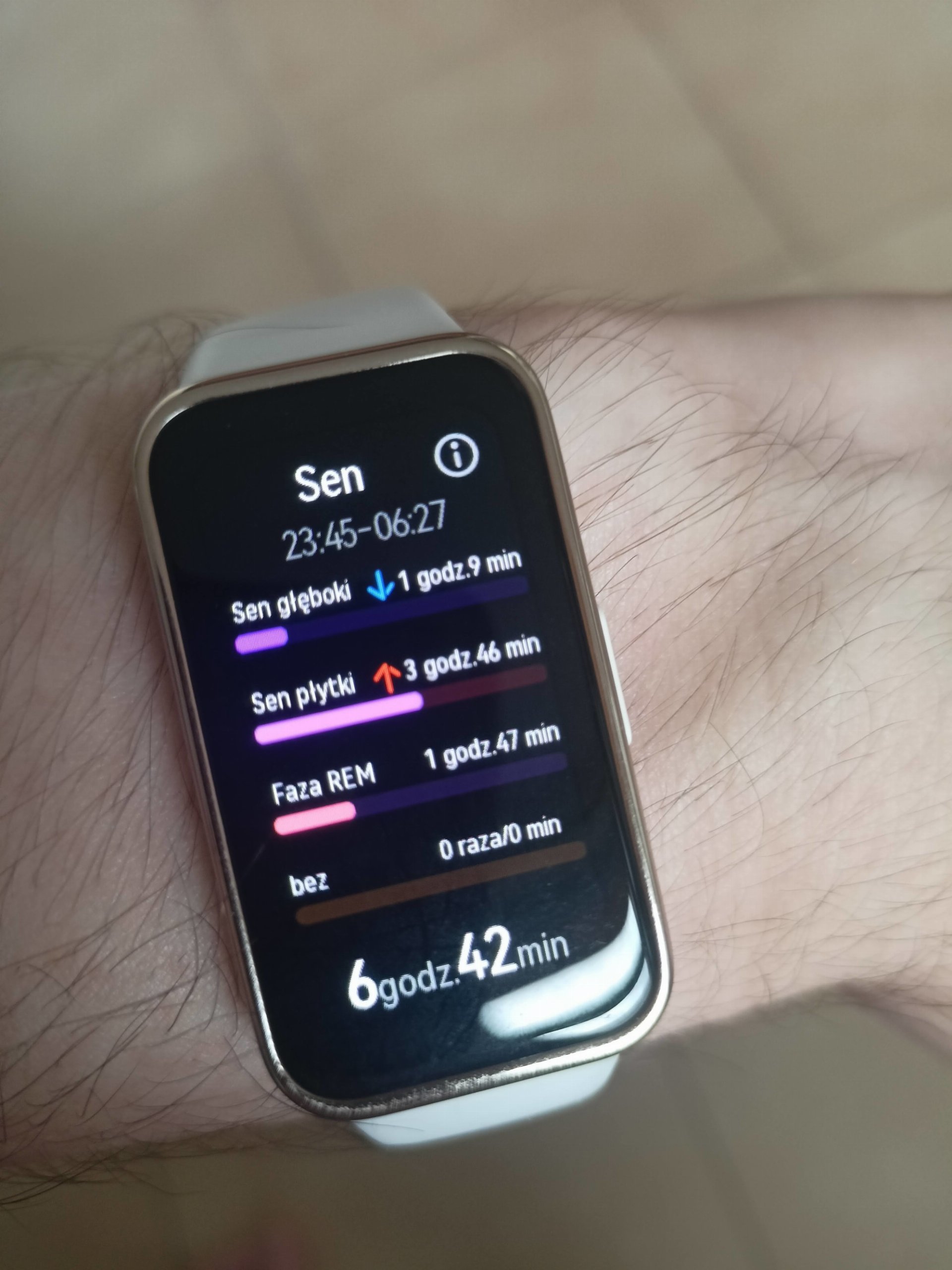 Oba urządzenia porównałem ze sobą także w nocy. Monitory snu także wskazały różne pomiary, choć różnice nie były aż tak duże i mieściły się w granicach błędu. Czas był prawie identyczny (WF3: 6:43, B9: 6:42), podobnie jak tętno (WF3: 44-68 odd./min, B9: 44-81 odd./min) i ogólna ocena (WF3: 85/100, B9: 82/100).