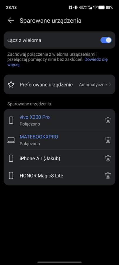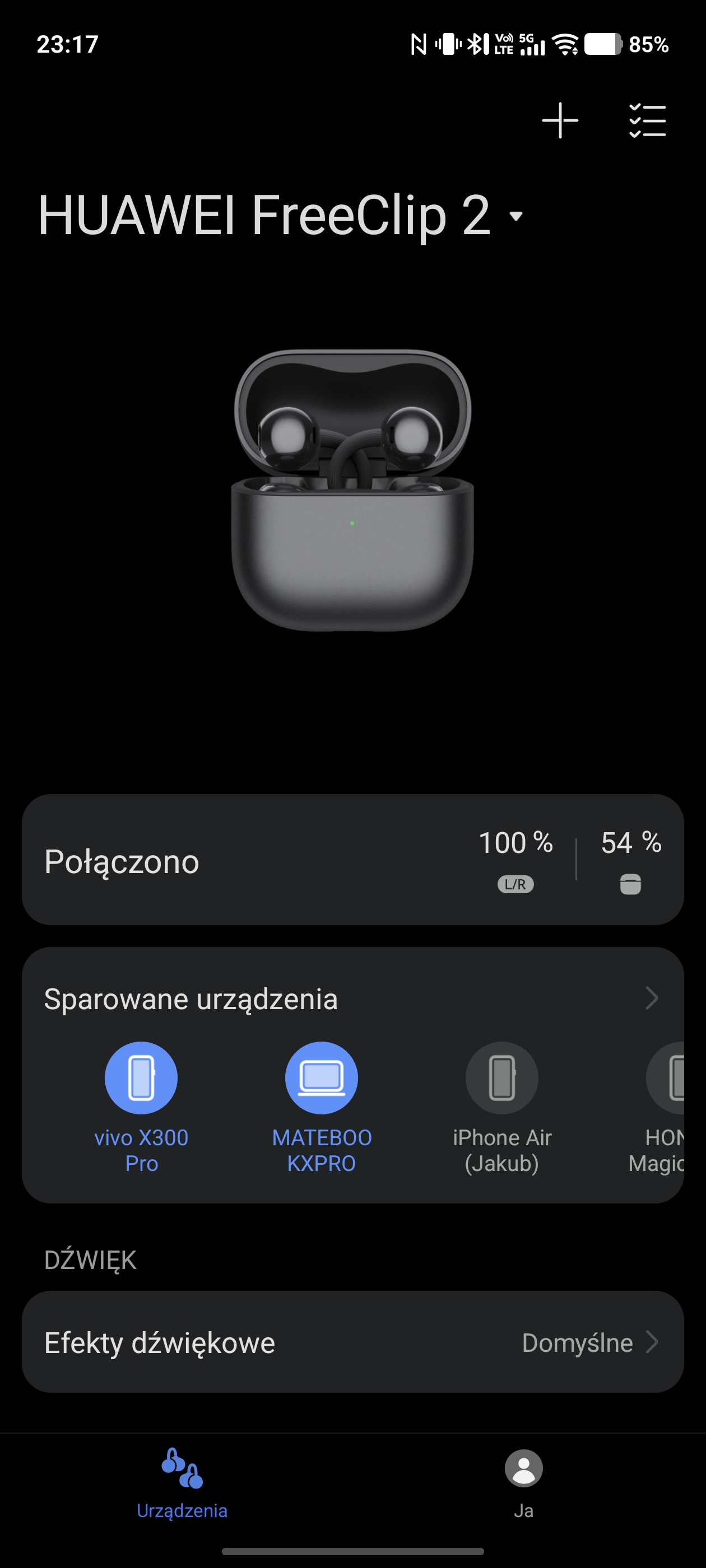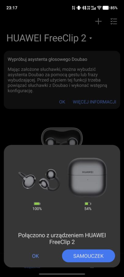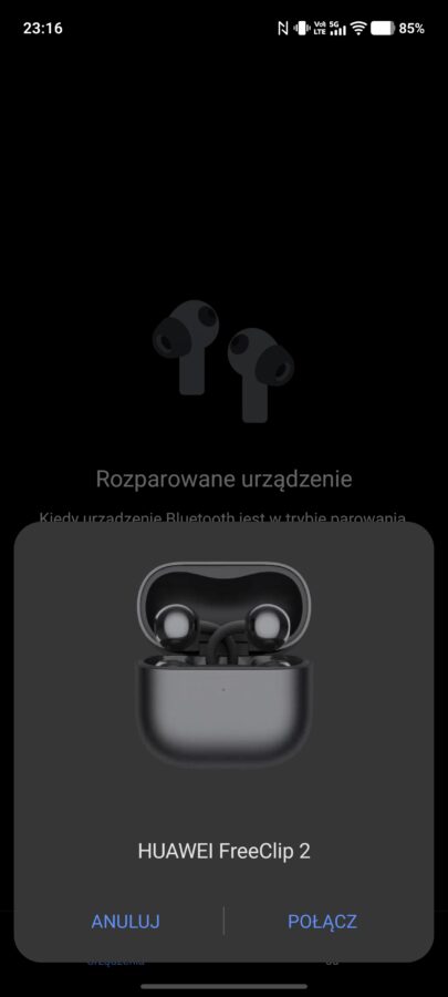 Huawei FreeClip 2 oferują też funkcję multipoint, czyli możliwość połączenia z dwoma urządzeniami w tym samym momencie. Wówczas, słuchawki przełączają się między aktywnym źródłem dźwięku, nadając priorytet temu urządzeniu, które rozpoczęło odtwarzanie jako pierwsze. To również działa nienagannie.