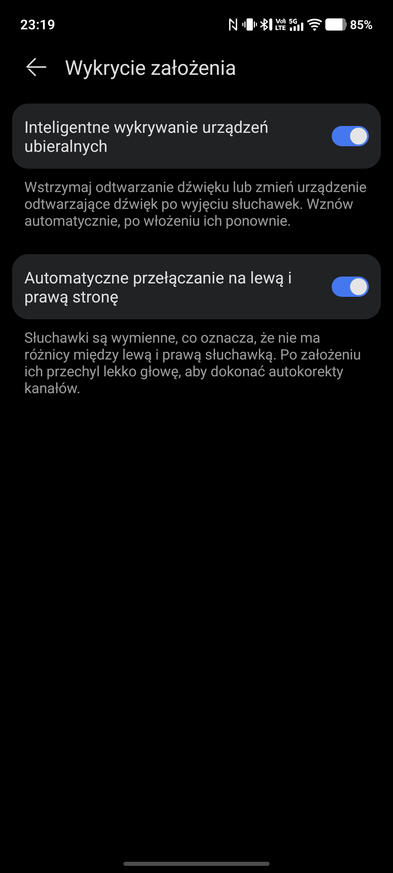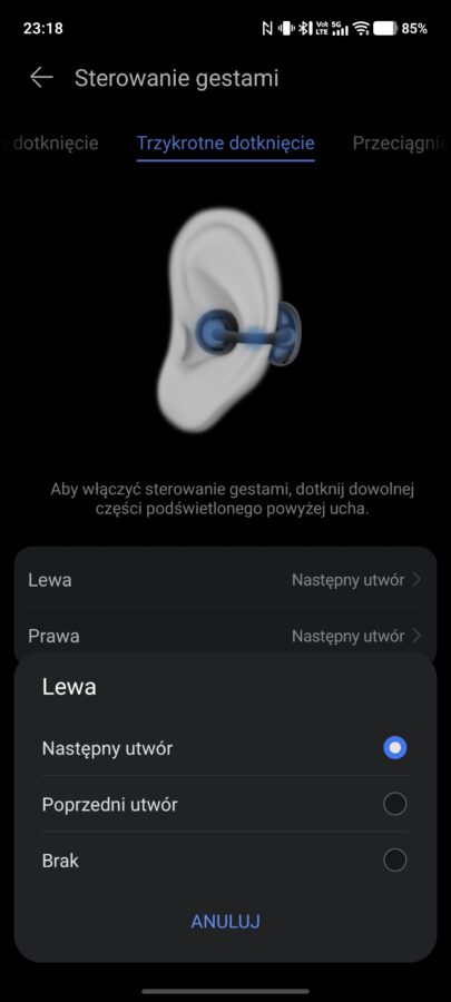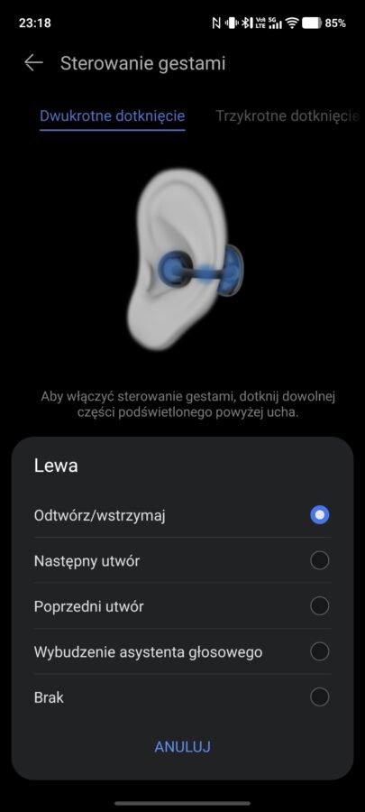 Wykonywane interakcje możemy w pewnym stopniu edytować, np. ustawić, by lewa słuchawka wywoływała poprzedni utwór, a prawa następny lub całkowicie wyłączyć wykrywanie konkretnego gestu. Całościowo nie mam zastrzeżeń co do działania gestów – słuchawki rozpoznają je w pełni poprawnie i ani razu nie przydarzyło mi się omyłkowe wykonanie interakcji.