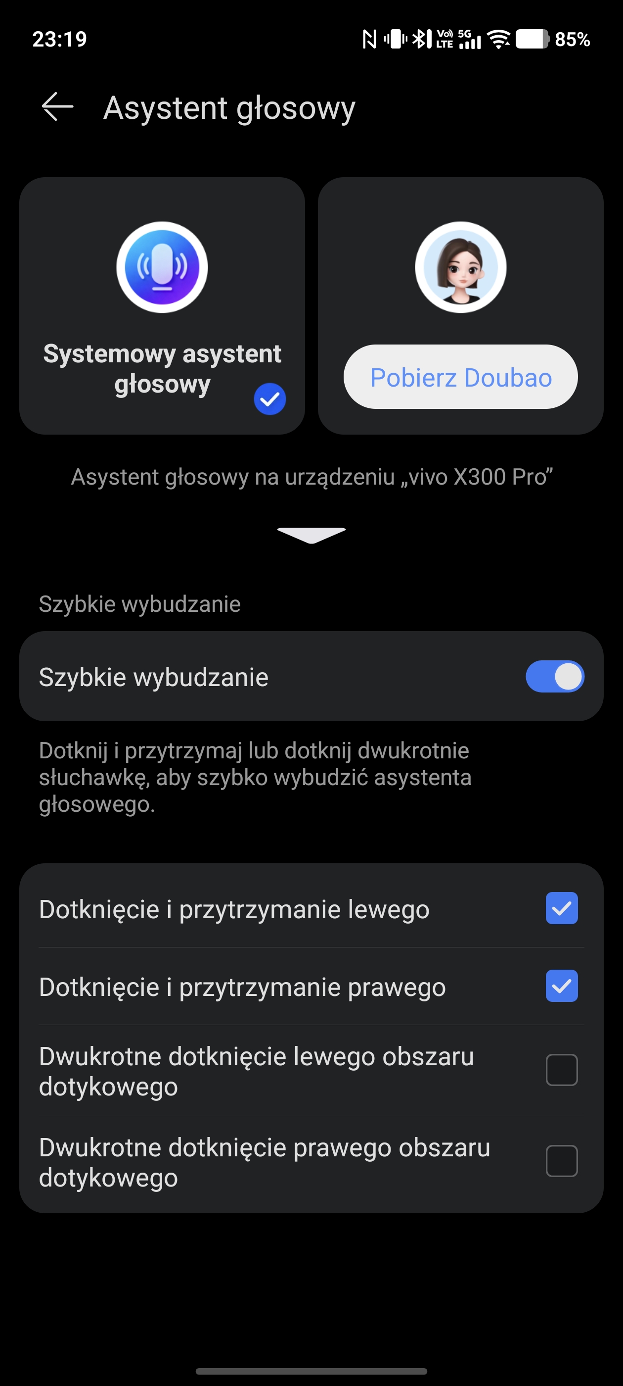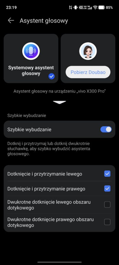 Słuchawki umożliwiają też korzystanie z systemowego asystenta głosowego i – tu ciekawostka – teoretycznie apka wyświetla możliwość wybrania autorskiego, wbudowanego asystenta Duobao, ale w praktyce już nie da się go aktywować. Jest też oczywiście możliwość aktualizacji oprogramowania słuchawek.