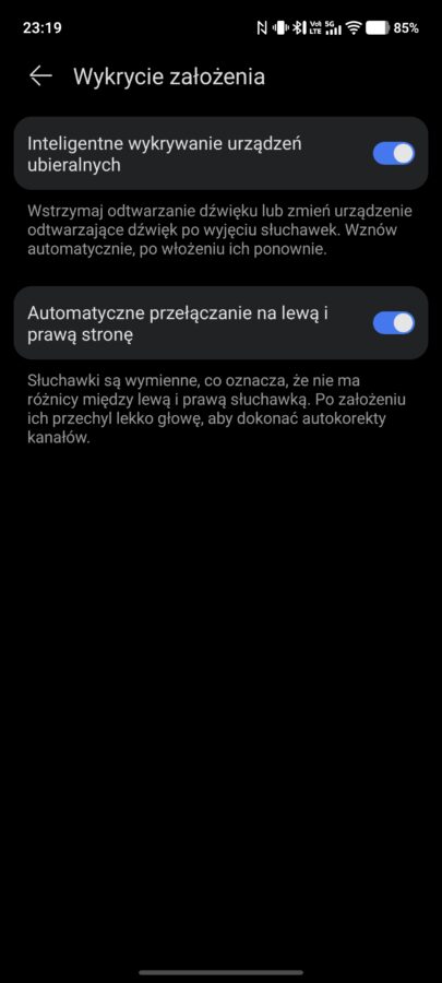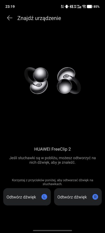 Co ważne, Huawei FreeClip 2 nie mają rozróżnienia na lewą i prawą słuchawkę. Obie możemy umieścić w dowolnym miejscu etui oraz – przede wszystkim – założyć je na dowolne ucho. Słuchawki potrafią samodzielnie wykrywać, w którym uchu się znajdują i korygować strony kanałów (w tym celu po ich założeniu wystarczy lekko pochylić głowę).