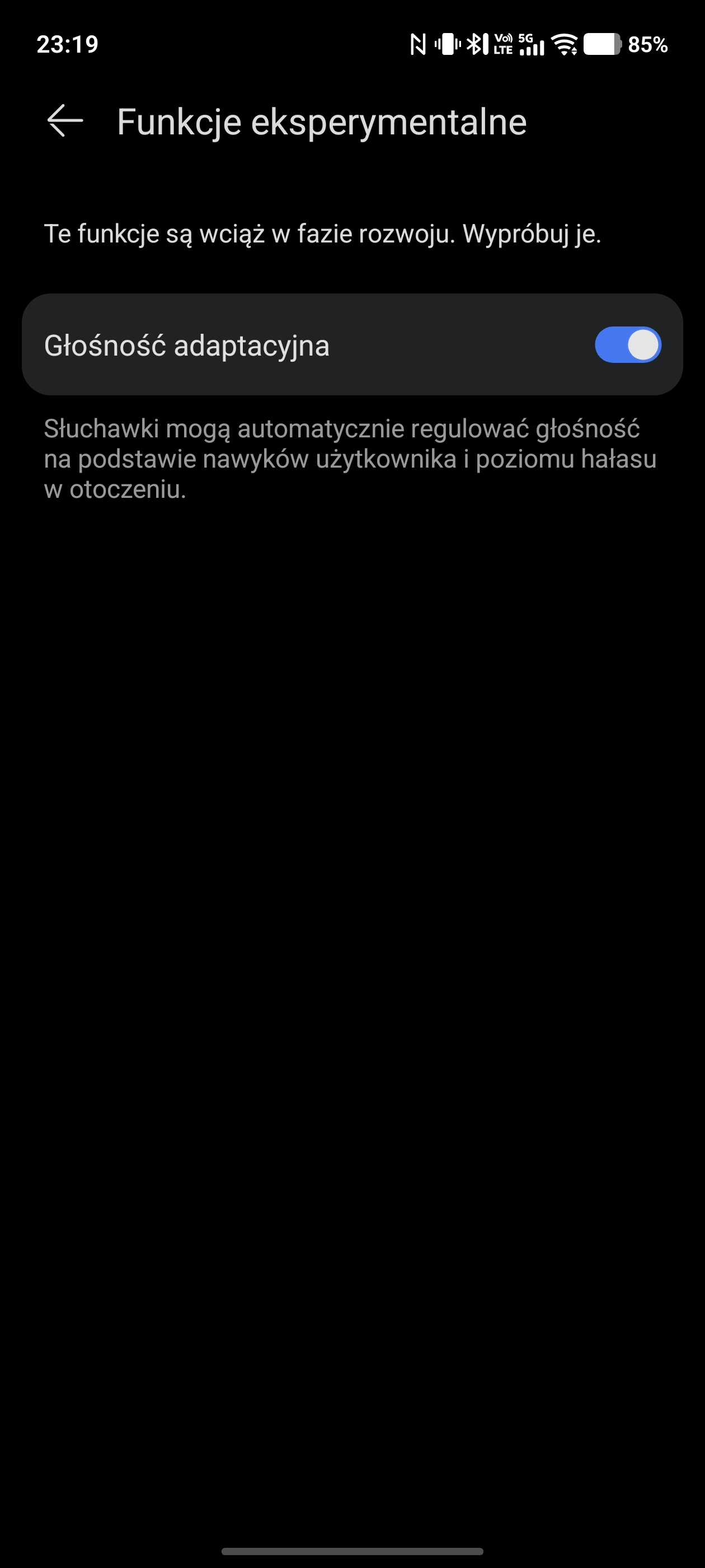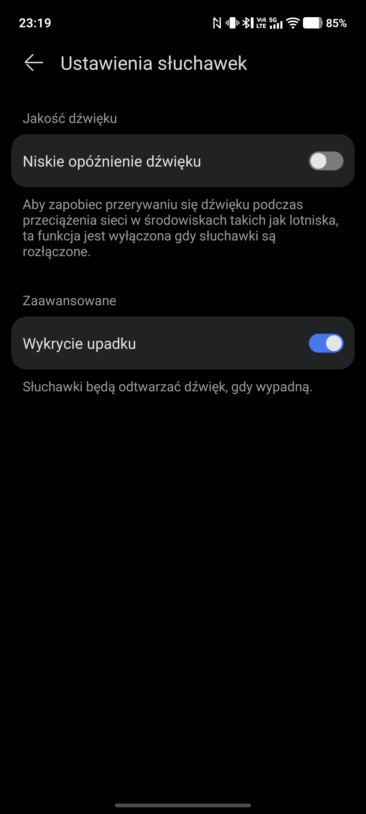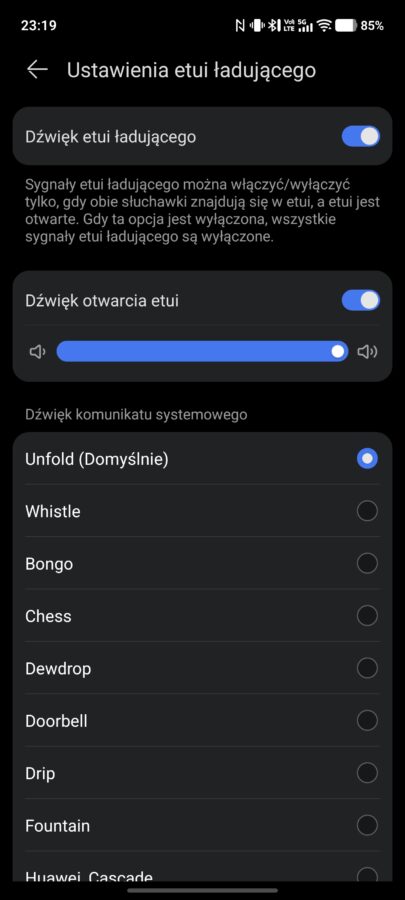 Pozostałe funkcje to opcja wyłączenia dźwięków etui (domyślnie wydaje ono dźwięki przy parowaniu i podłączeniu do ładowania), wykrywanie wypadnięcia słuchawek, a także głośność adaptacyjna, czyli automatyczna regulacja na podstawie poziomu hałasu w otoczeniu.