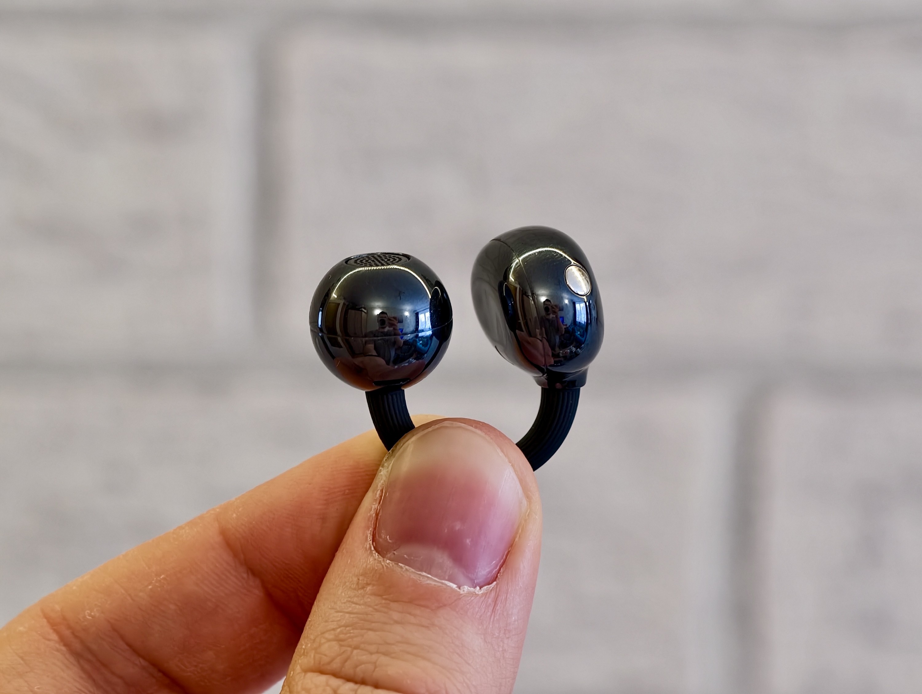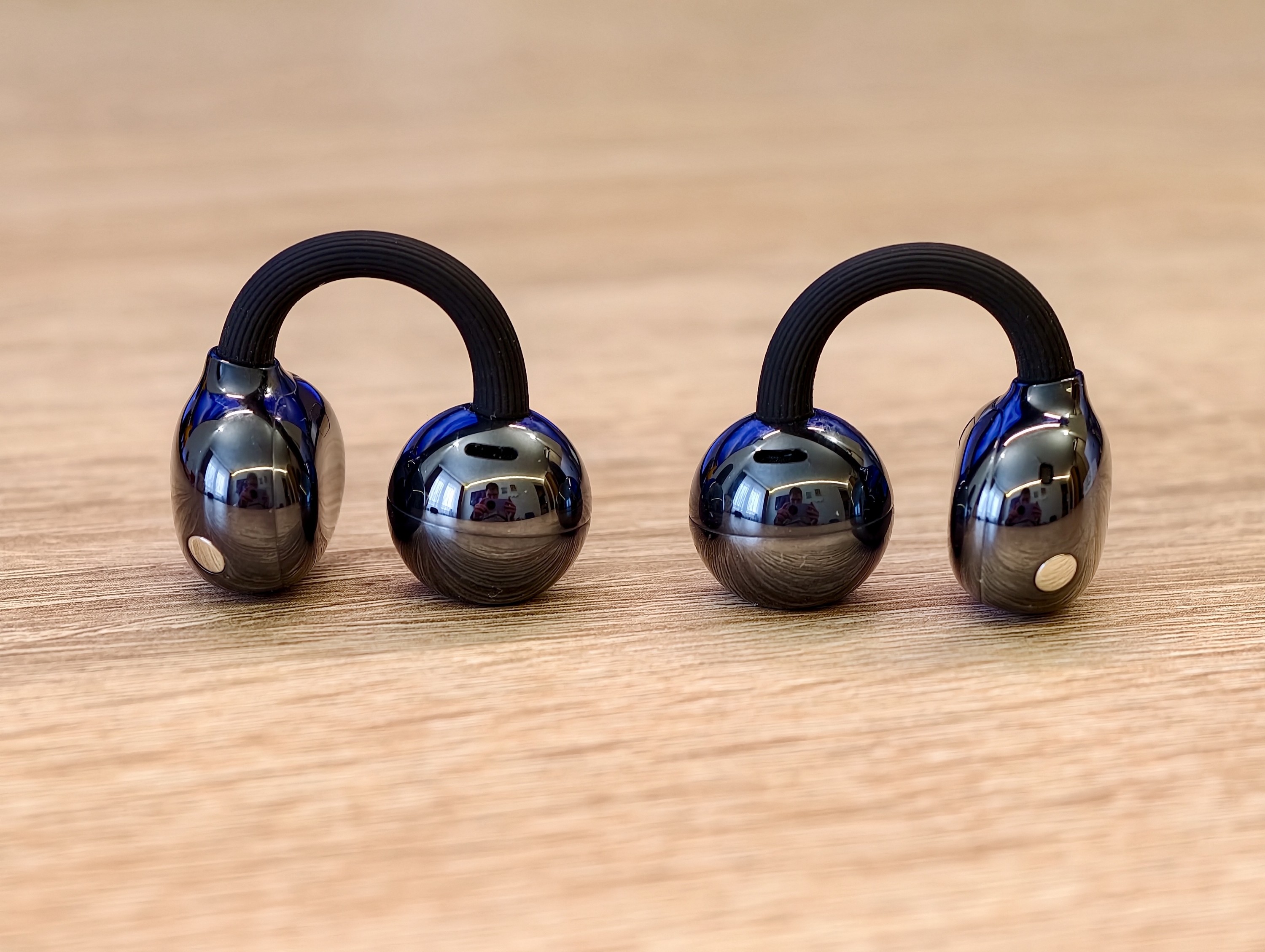 Zdecydowanie najciekawszy (pod względem wyglądu) element zestawu stanowią oczywiście same słuchawki. Ich nietypowa konstrukcja składa się z trzech elementów – spłaszczonej fasolki, w której znajduje się cała elektronika, mniejszej kulki mieszczącej przetwornik, mikrofony i czujniki oraz łączącego je ze sobą mostka C-bridge, czyli elastycznego pałąka.