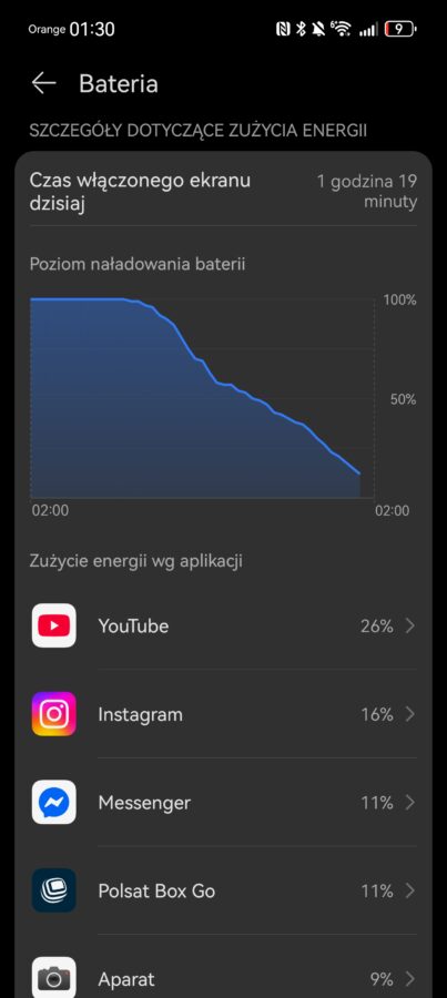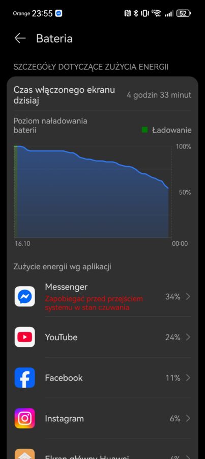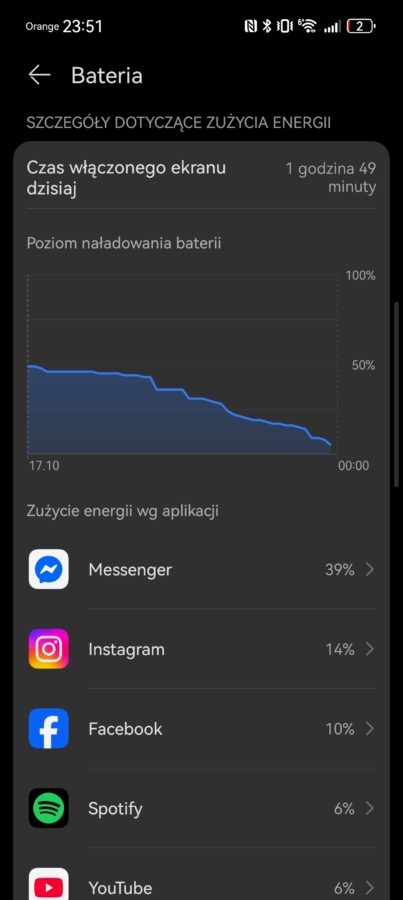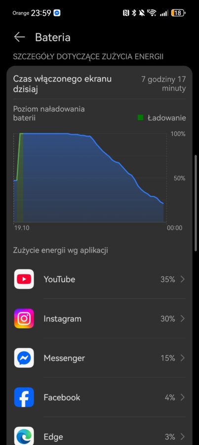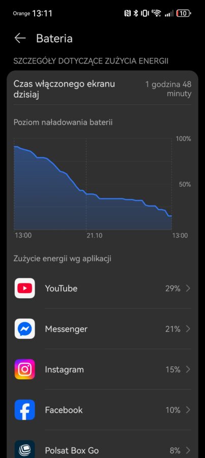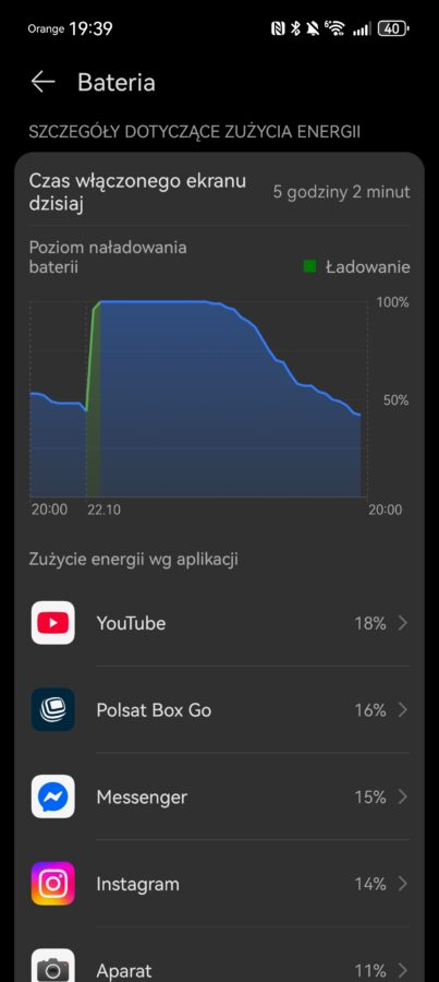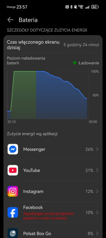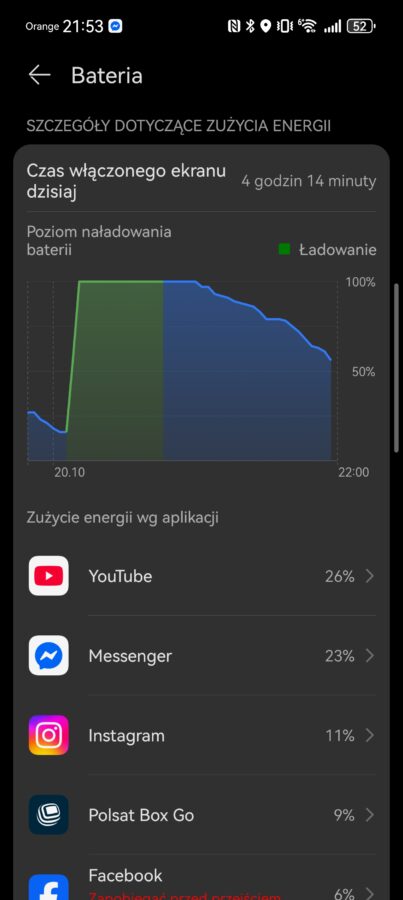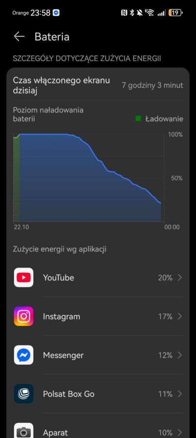 Interfejs EMUI nie ułatwia liczenia wyników Screen on Time, bo licznik resetuje się o północy, a nie z naładowaniami baterii, przez co kilku cykli – niestety – nie udało mi się uwiecznić na zrzutach ekranu.