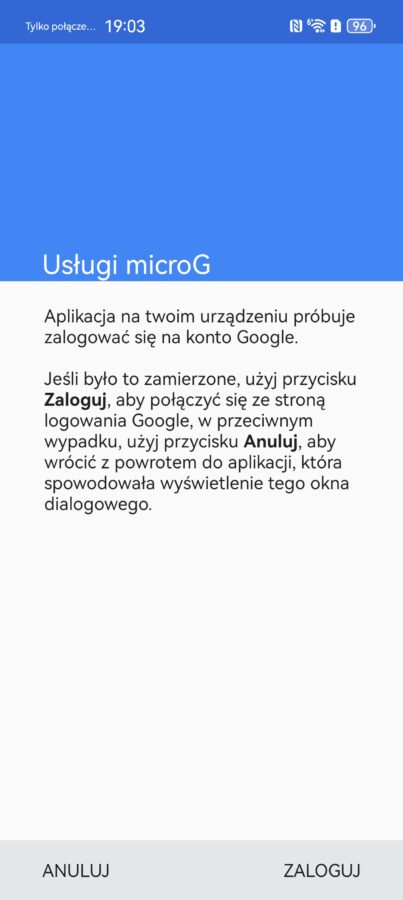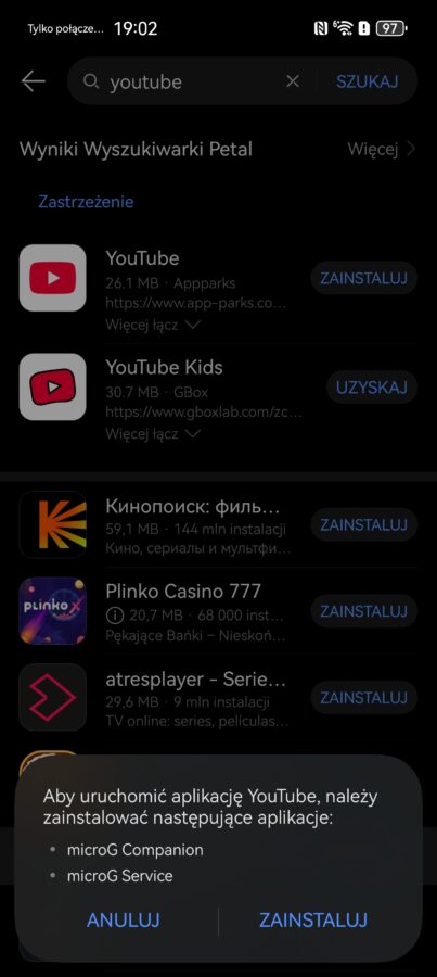 Pierwszą aplikację Google (konkretnie YouTube’a), zainstalowałem wykorzystując starą metodę, poprzez wyszukanie jej w Huawei AppGallery. Wówczas, system sam podpowiedział mi konieczność doinstalowania pakietu usług microG, stanowiących fundament poprawnego działania apek wymagających dostępu do GMS.