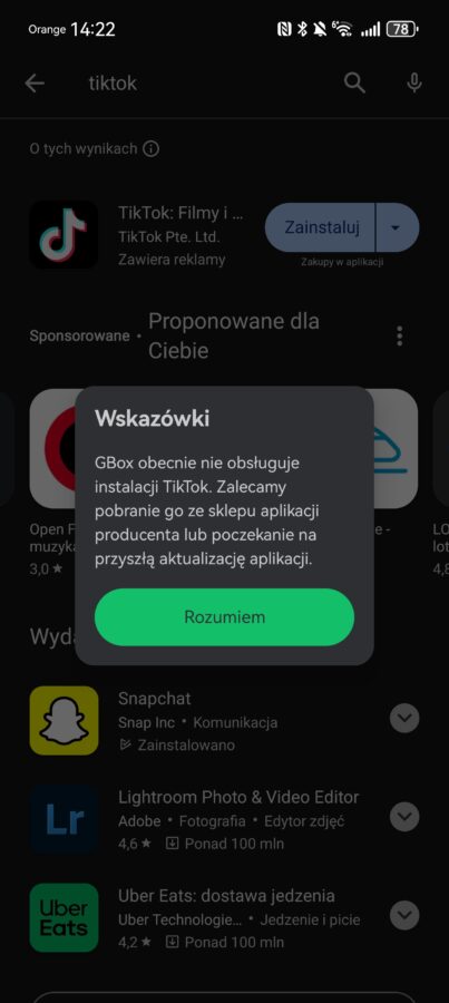 I to w zasadzie tyle. Zdecydowana większość aplikacji, w tym tych autorstwa Google (nawet Google Maps i Gemini) pobiera się i funkcjonuje bez problemów. Zdarzają się jednak czasem takie programy, których z niewiadomych przyczyn nie da się pobrać w ten sposób, o czym dostajemy stosowny komunikat. W moim przypadku taką apką był TikTok.