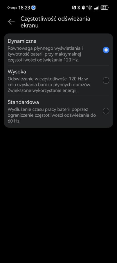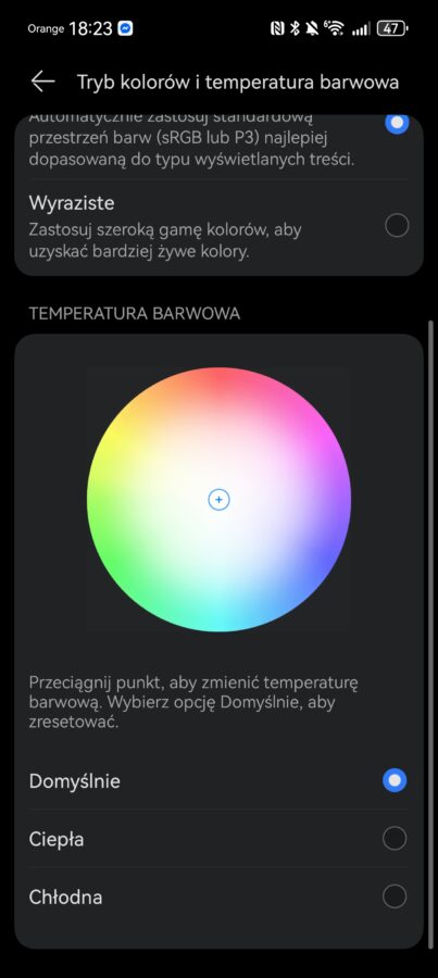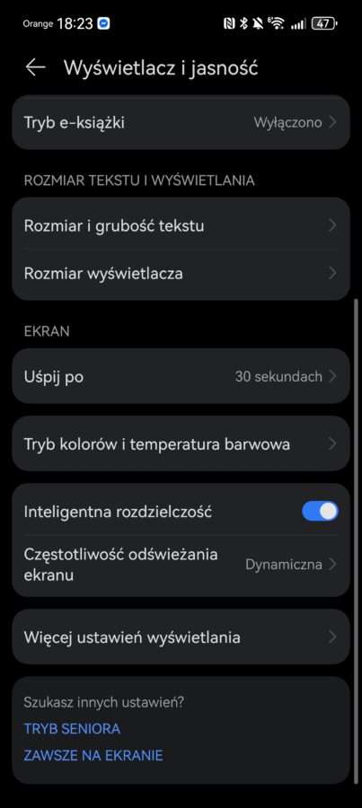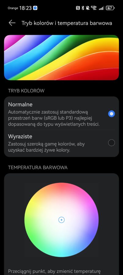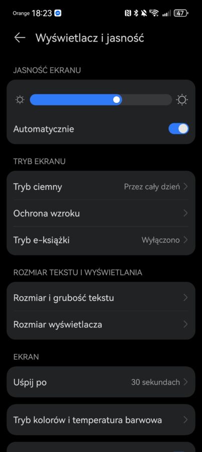 Wchodząc do ustawień urządzenia, a konkretniej do sekcji poświęconej ekranowi, możemy go nieco dopasować pod siebie. W kwestii kolorystyki, do wyboru mamy dwa tryby wyświetlania barw – normalne i wyraziste, przy czym domyślnie ustawione są normalne i wypadają w punkt. Można też dostosować temperaturę barwową, włączyć ochronę wzroku oraz zmienić częstotliwość odświeżania.