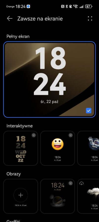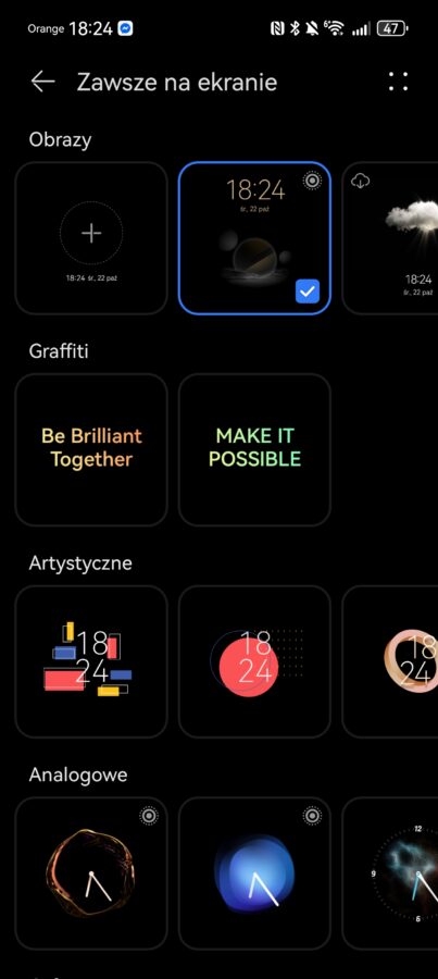Aby ekran AoD był prezentowany przez cały czas czy też wedle harmonogramu w określonych godzinach, musimy wybrać jeden z parudziesięciu motywów zegara, które wyświetlają się na czarnym tle. Z jednej strony trochę szkoda, z drugiej – nie stanowi to żadnej istotnej wady.