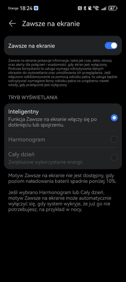 Całości dopełnia równiez obecność Always On Display, przy czym – podobnie, jak w poprzedniku – może się ono co prawda wyświetlać z przygaszoną tapetą, ale tylko w trybie inteligentnym. Oznacza to mniej więcej tyle, że ekran zapala się na chwilę, w momencie, gdy spojrzymy na telefon albo nim poruszymy.