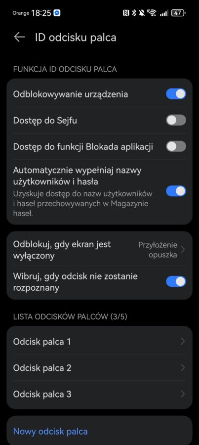 Nieco nietypowo wygląda też sam proces konfiguracji skanera odcisków palców, bowiem – zamiast po prostu przykładać opuszek kilka razy w różnych pozycjach – musimy wykonywać nim okrężne ruchy na czytniku. Ot, taka ciekawostka.