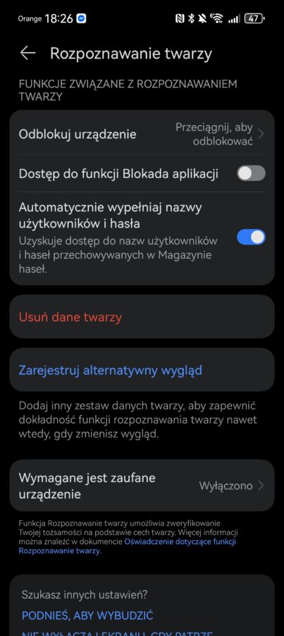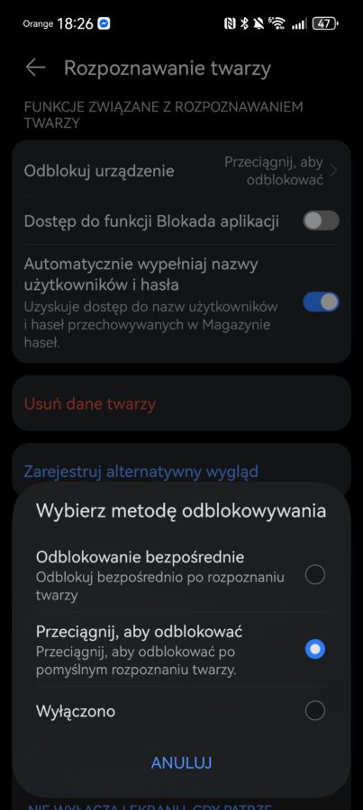 Skoro jest odblokowywanie liniami papilarnymi, to oczywiście nie mogło zabraknąć też rozpoznawania twarzy. Co bardzo miło zaskakuje, działa ono szybko i celnie nie tylko w jasnym otoczeniu, ale także wtedy, gdy jest niemal zupełnie ciemno. A to akurat, w przypadku rozpoznawania wykorzystującego przednią kamerkę (a nie skan 3D), nie jest tak oczywiste.