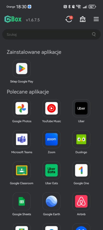 Następnie sięgnąłem do wspomnianej aplikacji GBox, która to wirtualizowała sklep Google Play na urządzeniu i pozwalała mi już na bezpośrednie, fizyczne pobieranie apek na telefon. Fizyczne bowiem nie meldują się one już w wirtualnej przestrzeni, jak miało to miejsce niegdyś w przypadku GBoxa, a normalnie pozostają zainstalowane na urządzeniu.