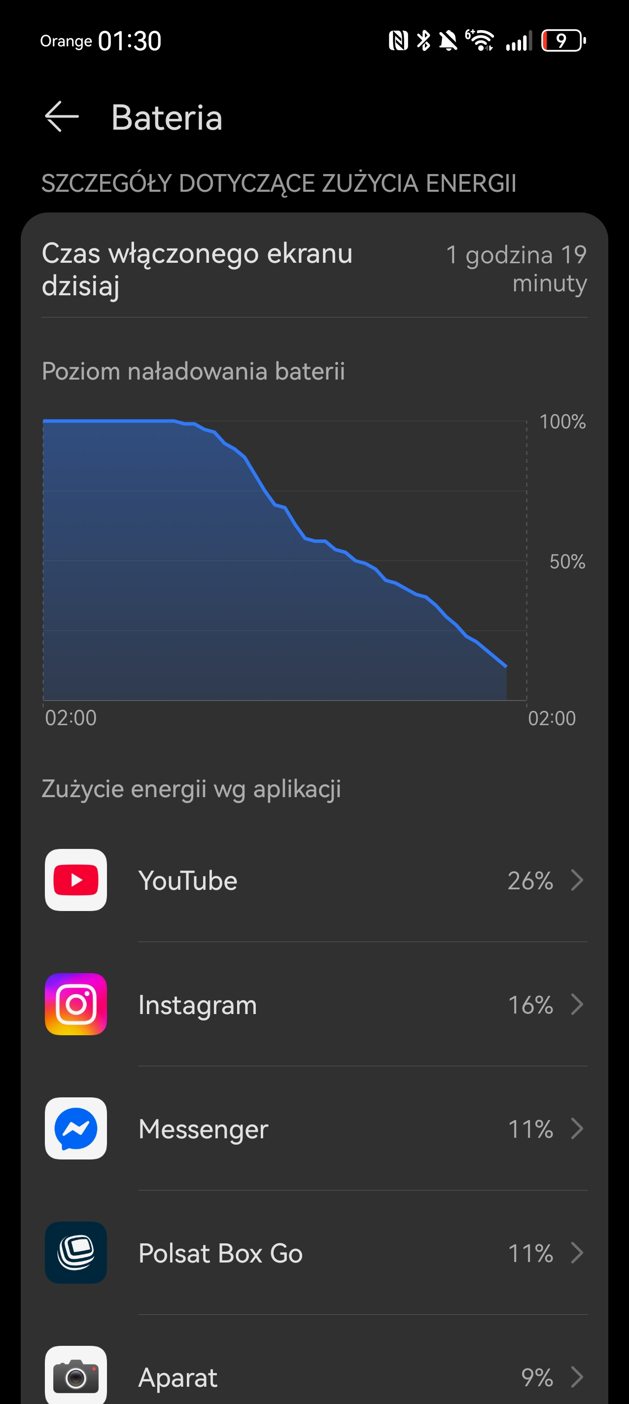 Interfejs EMUI nie ułatwia liczenia wyników Screen on Time, bo licznik resetuje się o północy, a nie z naładowaniami baterii, przez co kilku cykli – niestety – nie udało mi się uwiecznić na zrzutach ekranu.