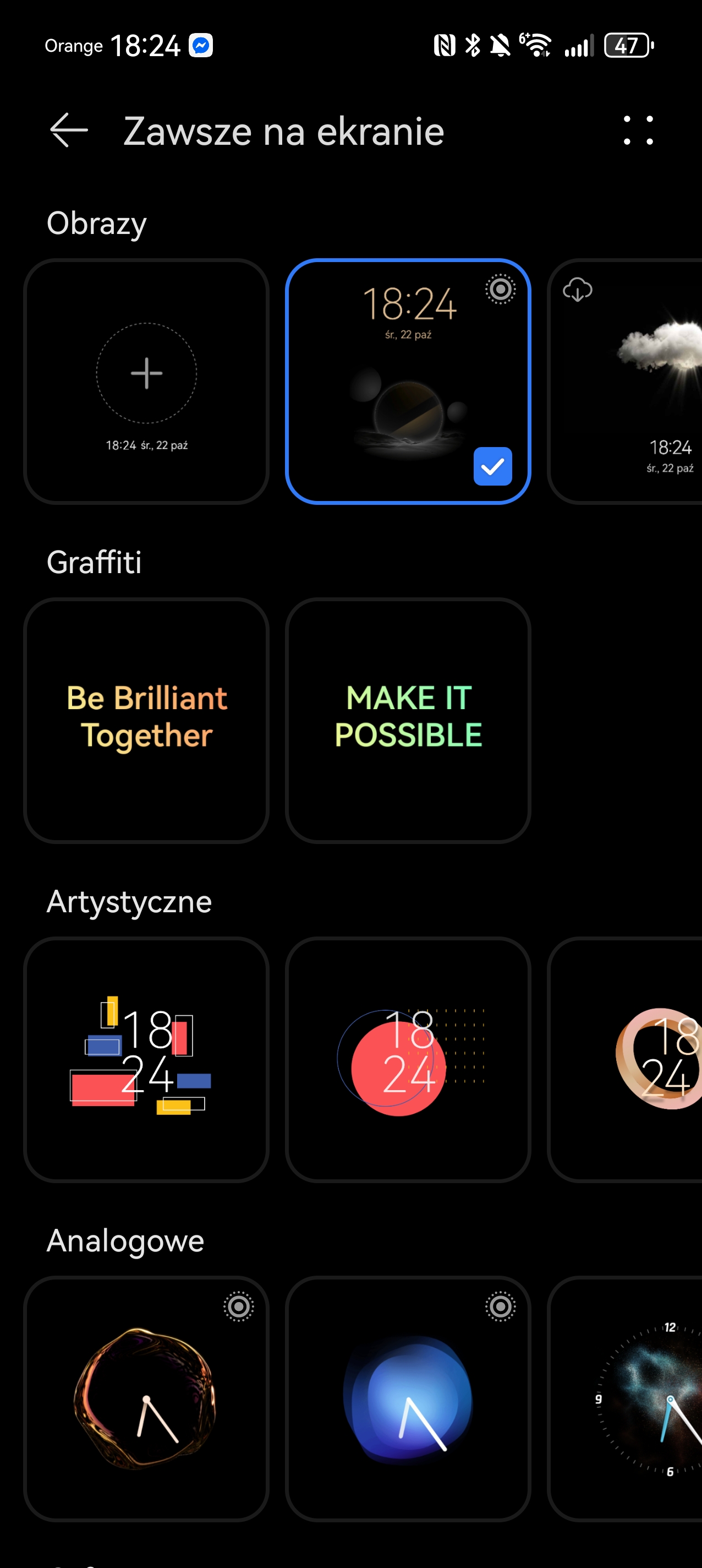 Aby ekran AoD był prezentowany przez cały czas czy też wedle harmonogramu w określonych godzinach, musimy wybrać jeden z parudziesięciu motywów zegara, które wyświetlają się na czarnym tle. Z jednej strony trochę szkoda, z drugiej – nie stanowi to żadnej istotnej wady.