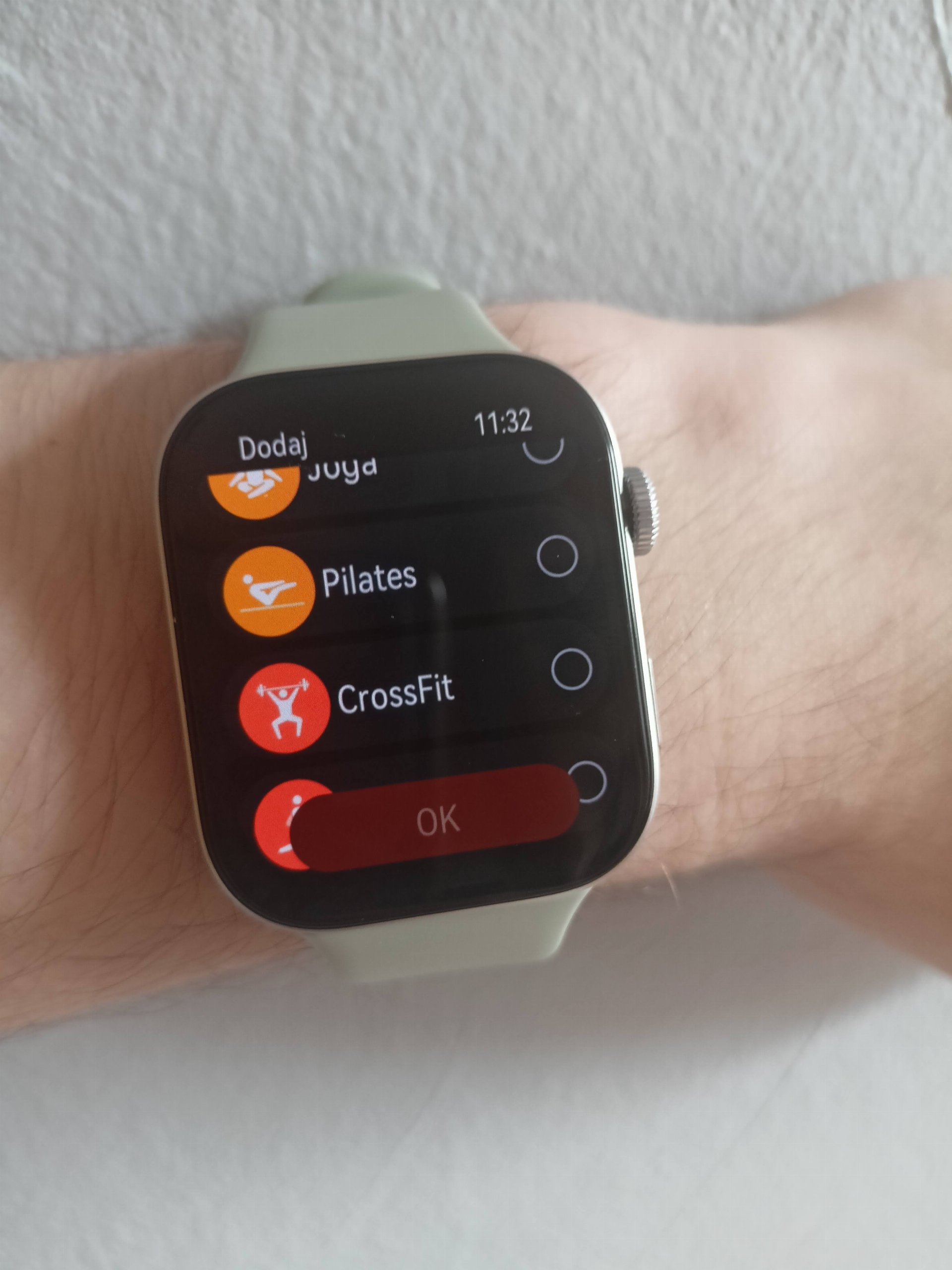 Drugi przycisk to nowość w serii Watch Fit. Mam tu bowiem na myśli obrotową koronkę. Pozwala ona naturalnie na przewijanie treści wyświetlanych na ekranie. Na tym jednak nie koniec, ponieważ do tego pojedyncze kliknięcie uruchamia ekran startowy lub – jeśli już na nim jesteśmy – menu główne z siatką aplikacji. Podwójne kliknięcie zaś pozwala podejrzeć i przełączać się pomiędzy uruchomionymi aplikacjami. Wreszcie, przytrzymanie umożliwia wyłączenie lub zrestartowanie urządzenia.