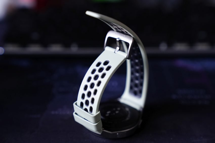 Gumowy pasek Watcha GT 2e (konkretnie wykonany z fluoroelastomeru) jest wygodny i nie powoduje reakcji alergicznej – a przynajmniej w moim przypadku nic takiego nie miało miejsca. Cieszy fakt, że domyślnie dodawane są dwie szlufki, dzięki czemu przy niewielkim nadgarstku pasek nie zwisa swobodnie oraz to, że w każdej chwili można go wymienić na inny.