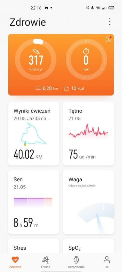 A co z dokładnością GPS-u? Podczas testów trzykrotnie wyszłam pojeździć na rowerze – biorąc pod uwagę, że mam go od tygodnia, to uważam to za całkiem niezły wynik ;) Za pierwszym razem przejechałam 20,35 km, za drugim 30,35, a za trzecim – 40,02 km. A przynajmniej tak wskazuje aplikacja Huawei Health, z którą synchronizuje się Huawei Watch GT 2e.
