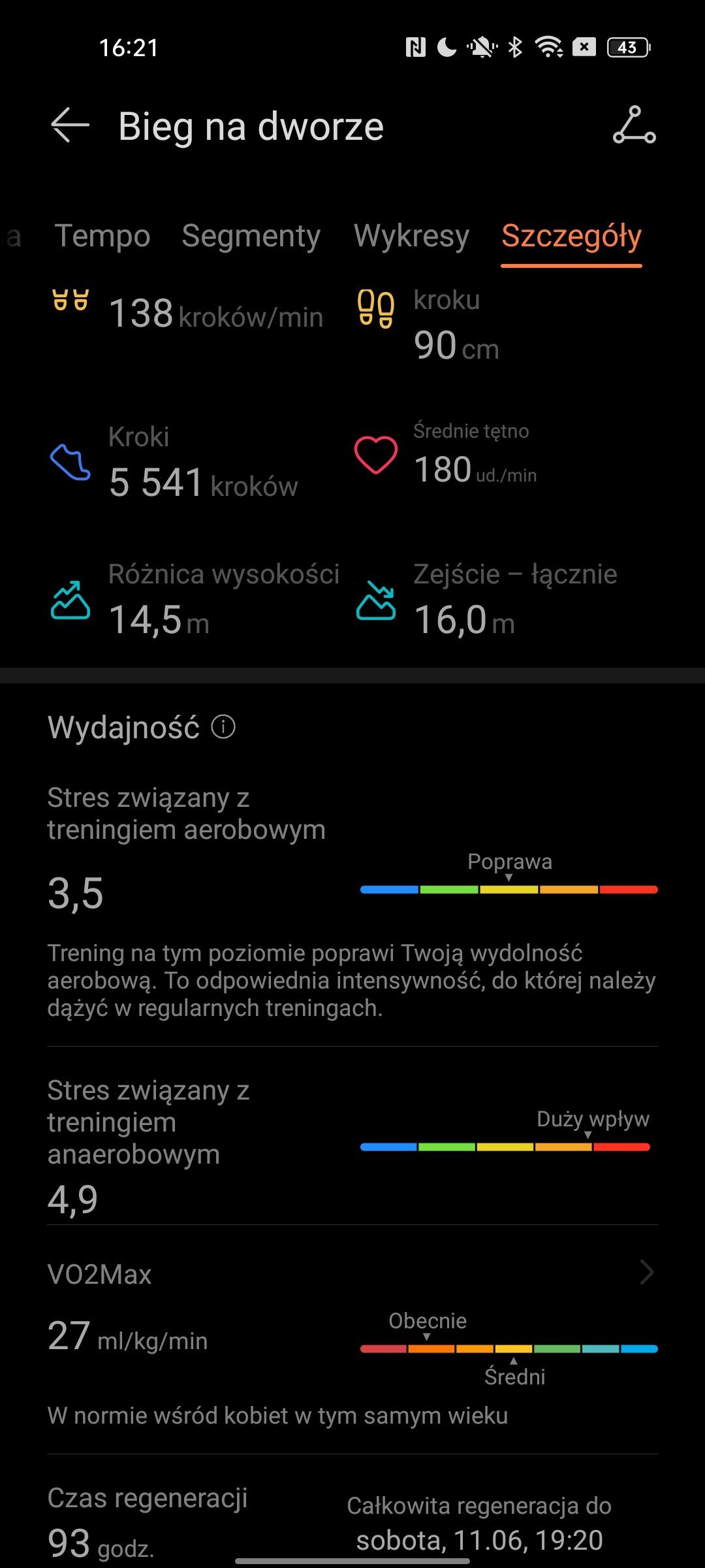 Jeśli jednak raz na jakiś czas (w moim przypadku co 2 dni) zdarzy nam się włączyć na Watchu GT 3 Pro 42 mm 40-minutowy trening biegowy lub śledzenie spaceru, oczywiście z włączonym GPS-em (ale bez AoD), czas ten skraca się – do ok. 4 dni.