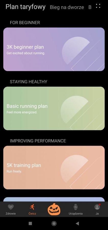 Program został podzielony na 5 kart: zdrowie, ćwicz, odkryj, urządzenia oraz ja. W pierwszej z nich znajdziemy dane dotyczące dzisiejszej aktywności, pomiarów pulsu, natleniania krwi, stanu snu oraz ostatnich treningów. Aplikacja daje również możliwość monitorowania cyklu menstruacyjnego. W zakładce ćwicz mamy dostęp do historycznych treningów posegregowanych w odpowiednie kategorie oraz do ustawień związanych z planami treningowymi, to tutaj można stworzyć indywidualny plan biegowy, o którym wspominałem nieco wyżej. Odkrywaj to z kolei miejsce, gdzie można znaleźć na przykład informacje dotyczące tego, jak przygotować się do treningu biegowego oraz jak zsynchronizować dane z zewnętrznymi aplikacjami.