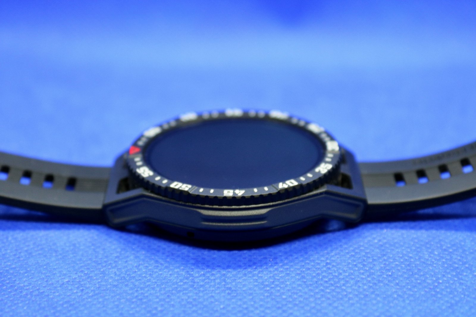 Na pierwszy rzut oka smartwatch wygląda naprawdę solidnie, pomimo tego, że wykonany jest niemal w całości z plastiku. Korpus został dodatkowo wzmocniony konstrukcją z włókien polimerowych. Na brzegu koperty mamy około 3-milimetrową ramkę, na której znalazły się cyfry, które mogą okazać się przydatne, kiedy wybierzemy styl zegara analogowego. Po niemal dwóch tygodniach użytkowania nie przychodzi mi na myśl nic innego, do czego można wykorzystać cyfry umieszczone na ramce. Według mnie bez nich zegarek prezentowałby się zdecydowanie lepiej i bardziej elegancko.