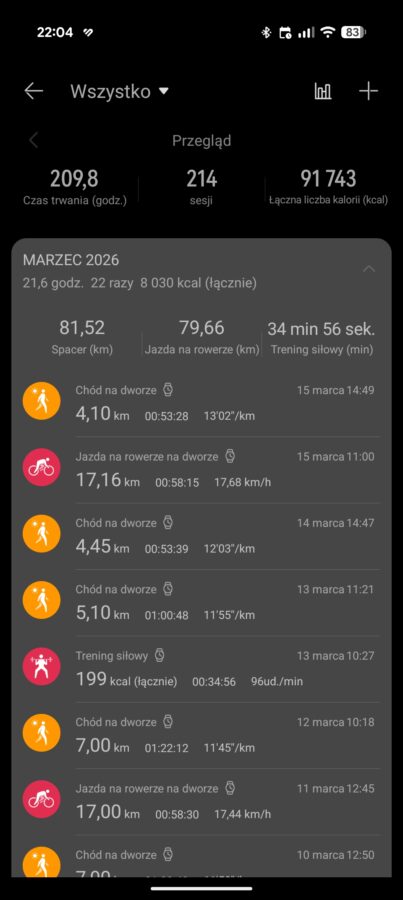 Postanowiłem podejść do testów w odmienny sposób i sprawdzić, jak bohater tego tekstu wypada w innych, raczej tych mniej intensywnych aktywnościach. W końcu nie każdy jest miłośnikiem biegania, a omawiane urządzenie wyposażone jest w długą listę funkcji sportowych i nic nie stoi na przeszkodzie, aby kupić go do spacerów, jazdy na rowerze, treningów siłowych czy nawet tylko do liczenia kroków w ciągu dnia.
