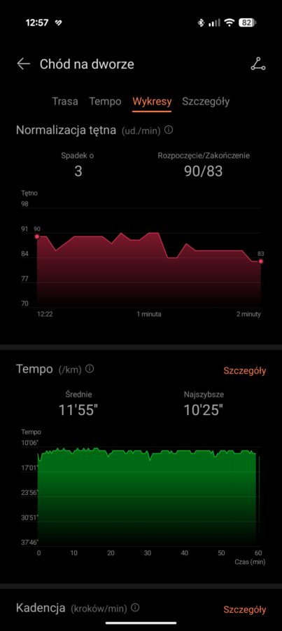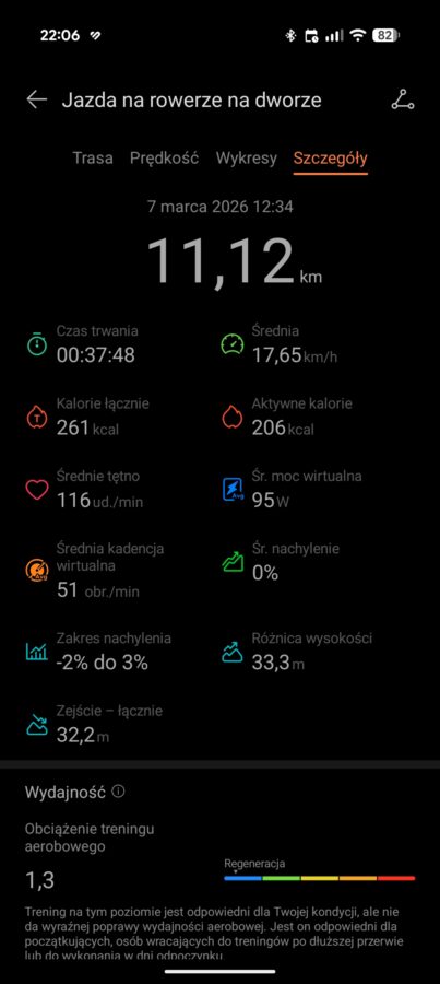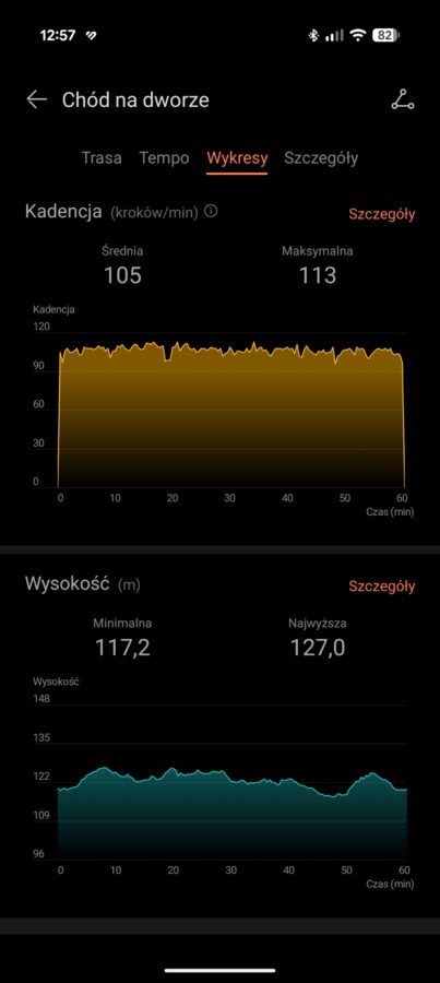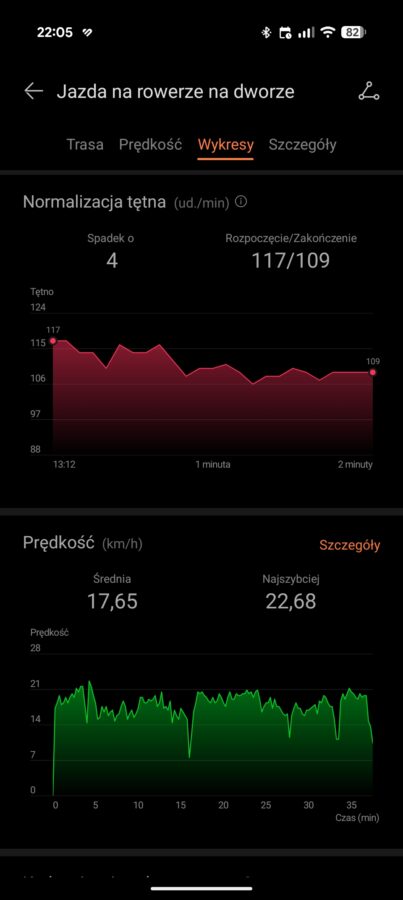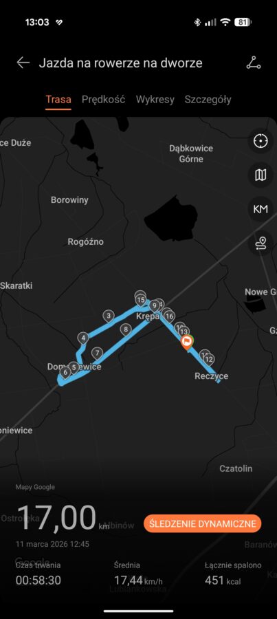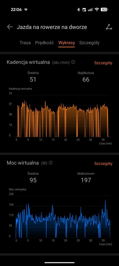 Zdaję sobie sprawę, że ostatnie dwie wirtualne wartości należy traktować w formie ciekawostki. Zaskoczyło mnie jednak, że na odcinkach, gdy moje nogi odpoczywały (np. zjazd z górki), smartwatch pokazywał, że aktualna kadencja wynosi zero. Natomiast, prawie od razu po rozpoczęciu pedałowania, kadencja rosła.