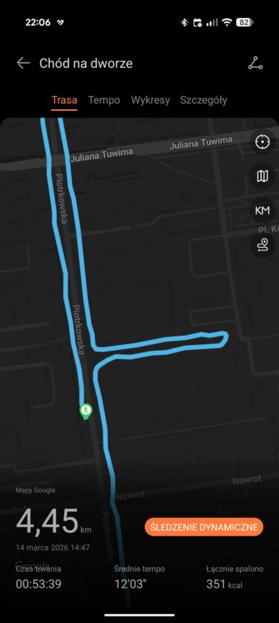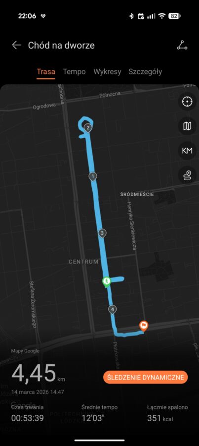 W sportowym smartwatchu – oprócz czujnika tętna – ważny jest też GPS. Huawei Watch GT Runner 2 na tym polu oferuje dwuzakresowy GPS, a także nową architekturę anteny o nazwie 3D Floating Antenna. Jak to wszystko działa? Po prostu świetnie. U mnie na wsi sygnał GPS łapany jest dosłownie po chwili, a w mieście po maksymalnie kilku sekundach. Natomiast ślad zapisywany jest precyzyjnie i smartwatch nie gubi się, gdy trzeba przykładowo przejść przez bramę w łódzkiej kamienicy, aby móc obejrzeć Pasaż Róży.