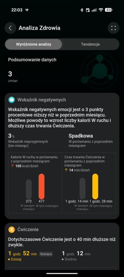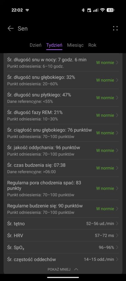 Czyli nie warto zakładać Huawei Watch GT Runner 2 na noc? To zależy. Po pierwsze, wszystkie smartwatche mają problemy z rozpoznawaniem poszczególnych faz snu, chociaż niekoniecznie aż takie. Po drugie, nadal mamy możliwość śledzenia tętna, poziomu natlenienia krwi czy HRV podczas snu – obserwacja tych danych, a także zmieniających się trendów, pozwala ocenić poziom regeneracji organizmu, zauważyć duże przetrenowanie, a nawet otrzymać informację o zbliżającym się przeziębieniu.
