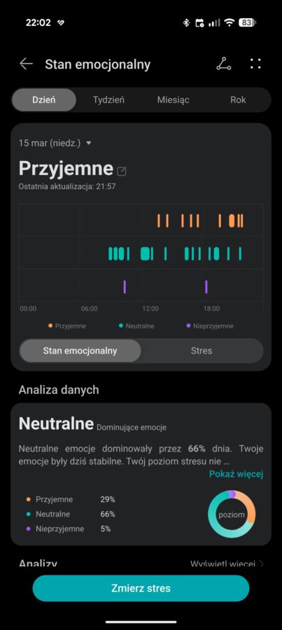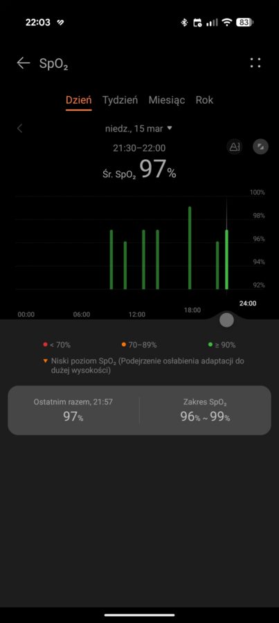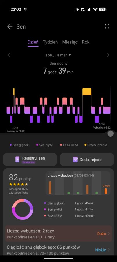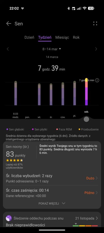 Skoro temat snu został już poruszony, to wypada pociągnąć go dalej. Szczególnie, że w przypadku smartwatchy Huawei sytuacja jest dość ciekawa. Zazwyczaj świetnie radzą sobie z wykrywaniem momentu obudzenia i ewentualnych przebudzeń w nocy. Nie mają też problemów z rozpoznawaniem drzemek w ciągu dnia i podejrzewam, że moment zaśnięcia również jest wykrywany z dużą precyzją.