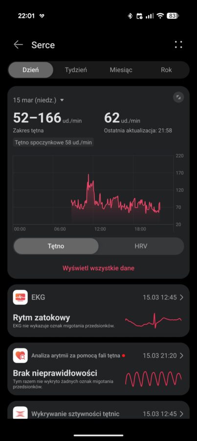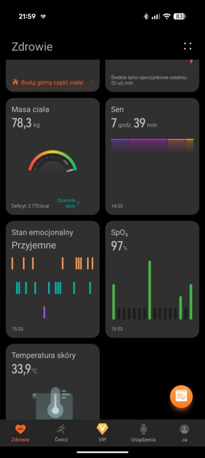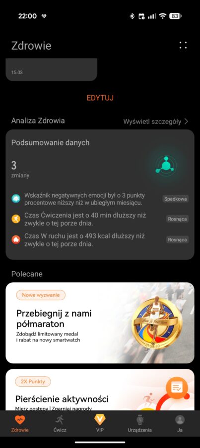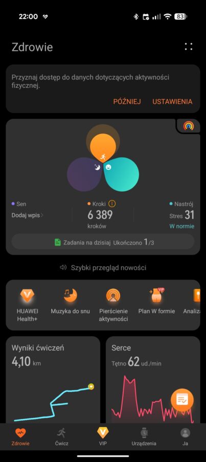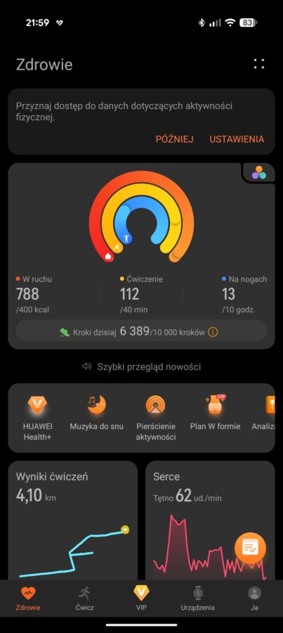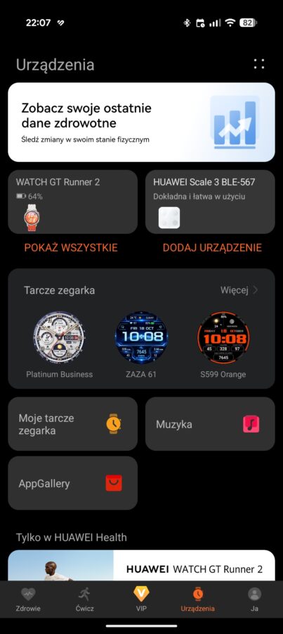 Do zarządzenia zegarkiem, a także do przeglądania danych na większym ekranie, przeznaczona jest dobrze znana aplikacja Huawei Zdrowie. Nie ma chyba większego sensu, aby po raz kolejny rozpisywać się na ten tego oprogramowania. Mogę jednak wspomnieć, że dotychczas nie miałem żadnych problemów z aplikacją, uważam ją za dopracowaną, ale trochę zbyt nachalnie stara się wcisnąć subskrypcję Huawei Health+. Oczywiście ta subskrypcja nie jest potrzebna, aby korzystać ze wszystkich podstawowych funkcji.