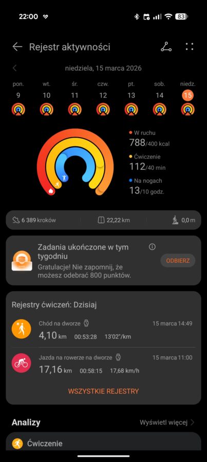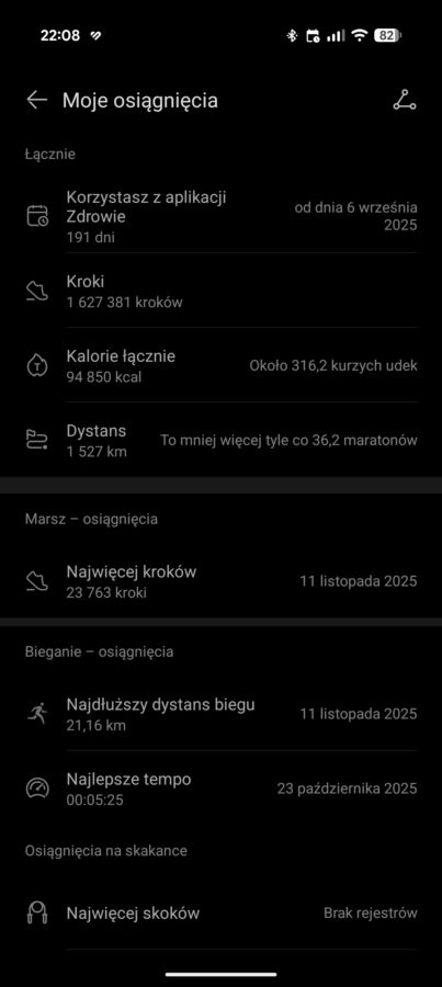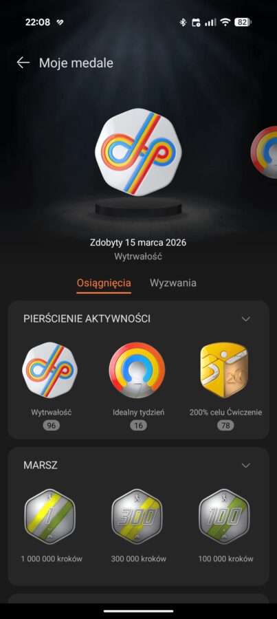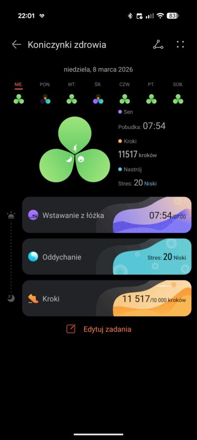 Co ciekawe, oprócz tych podstawowych celów, dostępne są też koniczynki zdrowia, które skupiają się na jakości snu, krokach, stresie i mogą uwzględniać dodatkowe zadania jak pomiary ciśnienia. Oczywiście Huawei Watch GT Runner 2 nie udaje, że potrafi mierzyć ciśnienie – musimy wprowadzić dane z zewnętrznego ciśnieniomierza. Koniczynki można zaliczać w ciągu dnia, chociażby starając się chodzić spać o regularnych godzinach i dbając o odpowiednią długość snu.