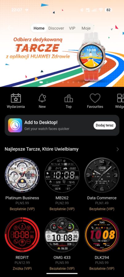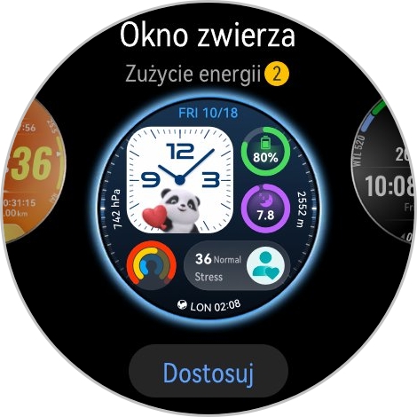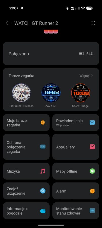 Dostępnych jest sporo tarcz – kilka znajdziemy na zegarku, kilkadziesiąt pozostałych stworzonych przez Huawei można wgrać z poziomu aplikacji Huawei Zdrowie. Do tego dochodzi długa lista tarcz stworzonych przez zewnętrznych twórców – w sklepie są tarcze darmowe oraz te, które wymagają wyciągnięcia z portfela kilku lub kilkunastu złotych. Wiele tarcz można spersonalizować – nawet te zaprojektowane dla biegaczy skonfigurujemy tak, aby wyświetlały bardziej podstawowe dane, jak puls czy liczba wykonanych kroków.