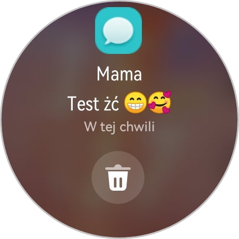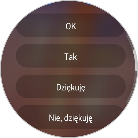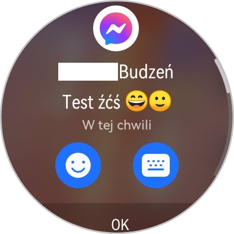 Na otrzymane wiadomości odpowiemy za pomocą emoji lub wyślemy jedną z odpowiedzi z szablonu (można dodać własne) lub mamy opcję napisania wiadomość z wykorzystaniem klawiatury ekranowej (średnio to wygodne na małym wyświetlaczu). Nie działa to w przypadku wszystkich komunikatorów – u mnie przykładowo Facebook Messenger jest obsługiwany, ale aplikacja do SMS-ów (Wiadomości Google) już niekoniecznie. Jeśli apka nie jest wspierana, mamy możliwość tylko wyświetlenia powiadomienia. Smartwatch pokazuje polskie litery i emoji, ale zdjęć już nie.