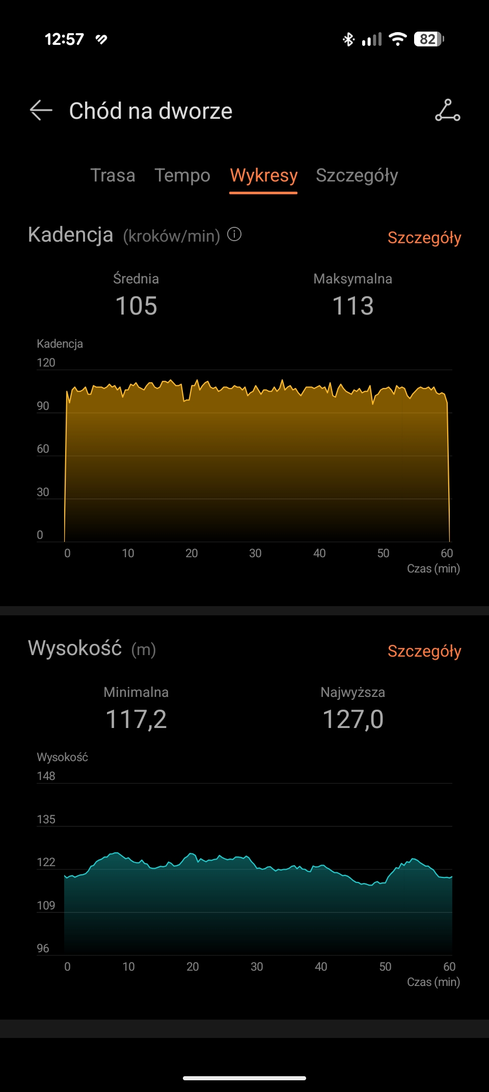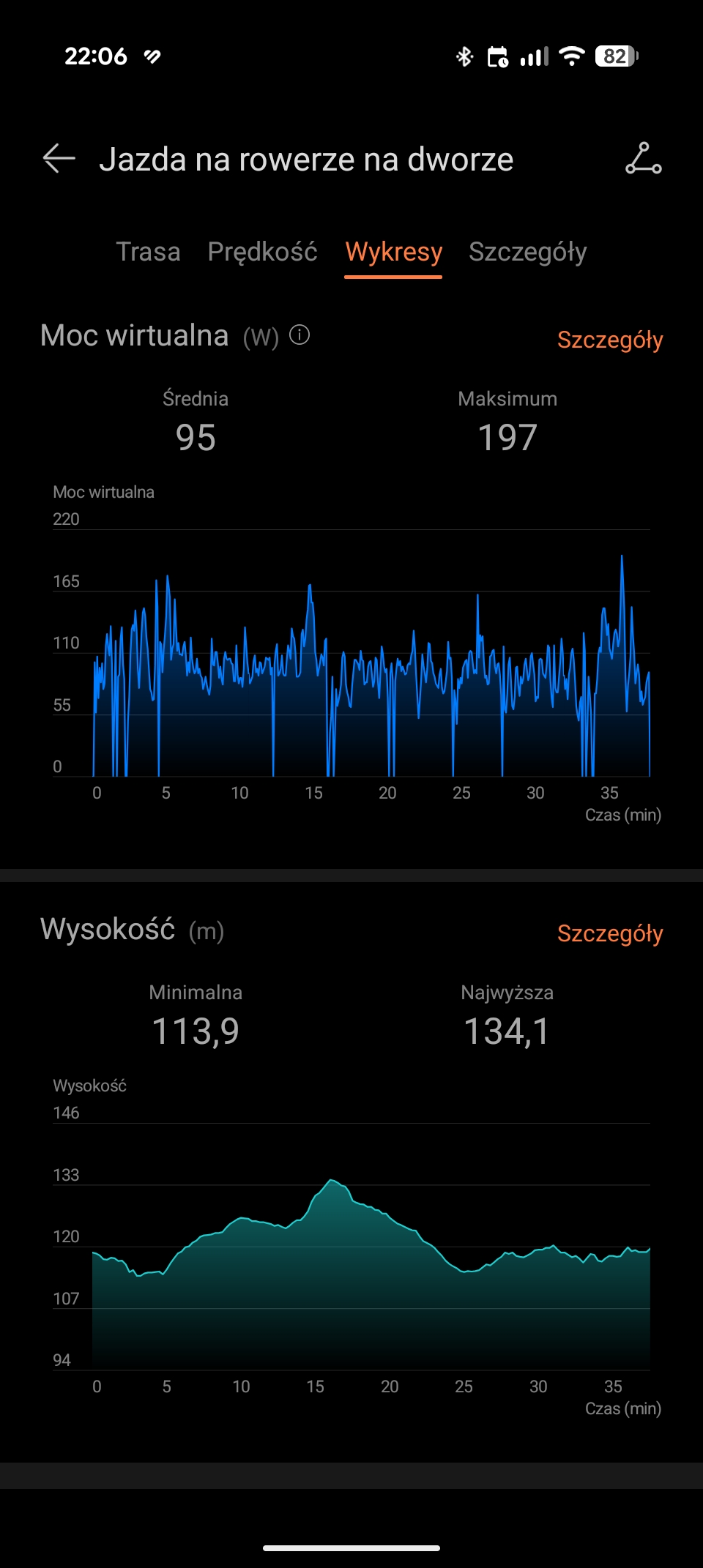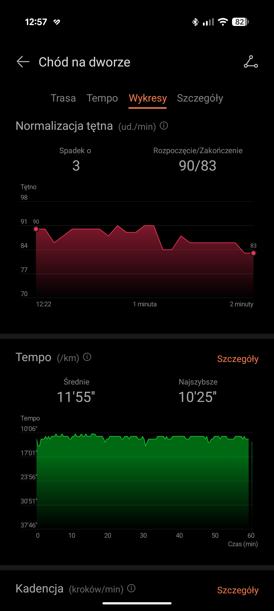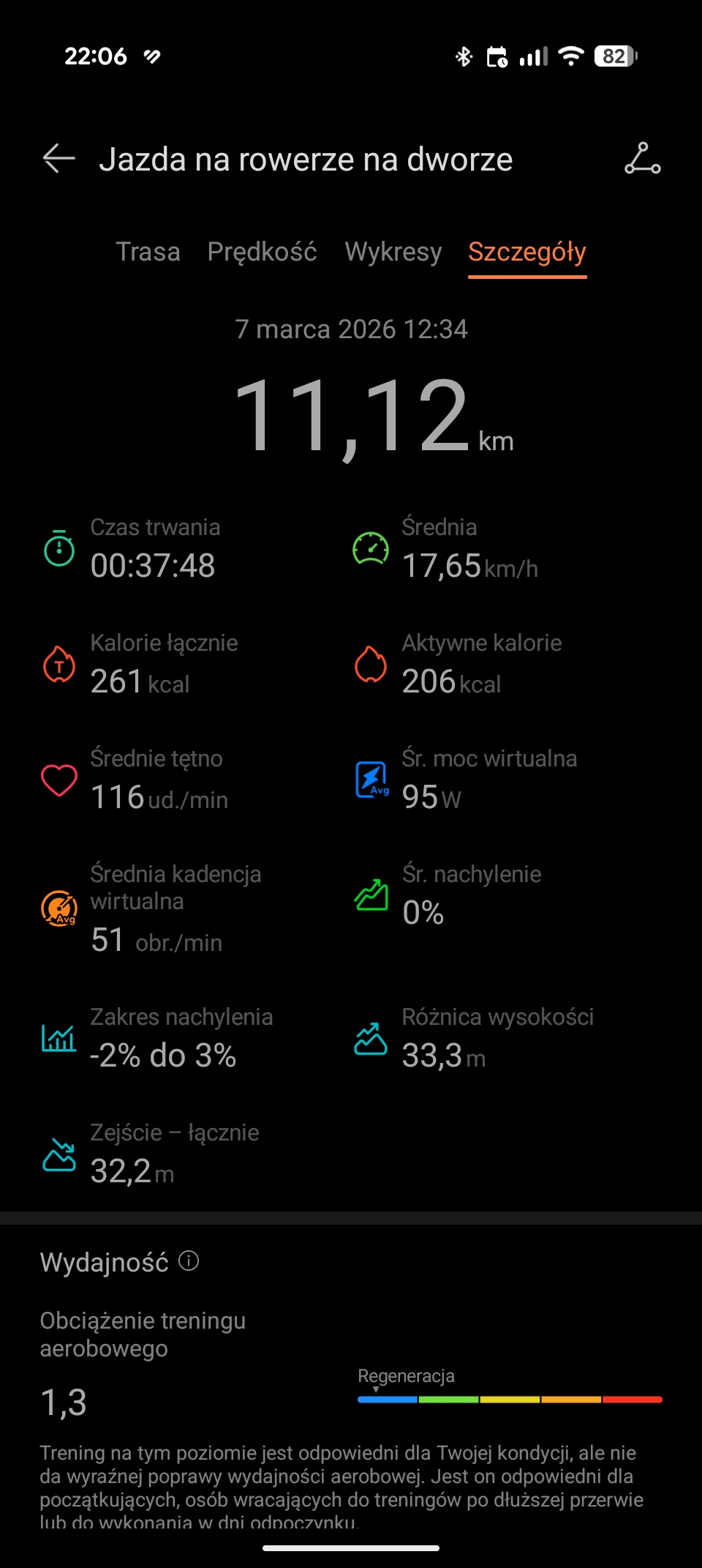 Zdaję sobie sprawę, że ostatnie dwie wirtualne wartości należy traktować w formie ciekawostki. Zaskoczyło mnie jednak, że na odcinkach, gdy moje nogi odpoczywały (np. zjazd z górki), smartwatch pokazywał, że aktualna kadencja wynosi zero. Natomiast, prawie od razu po rozpoczęciu pedałowania, kadencja rosła.