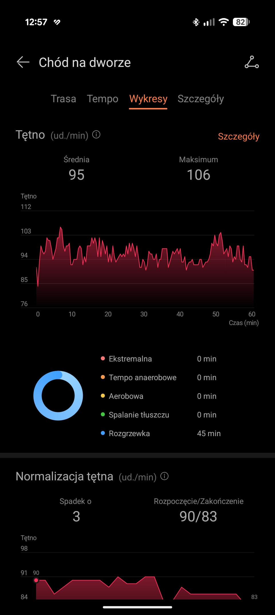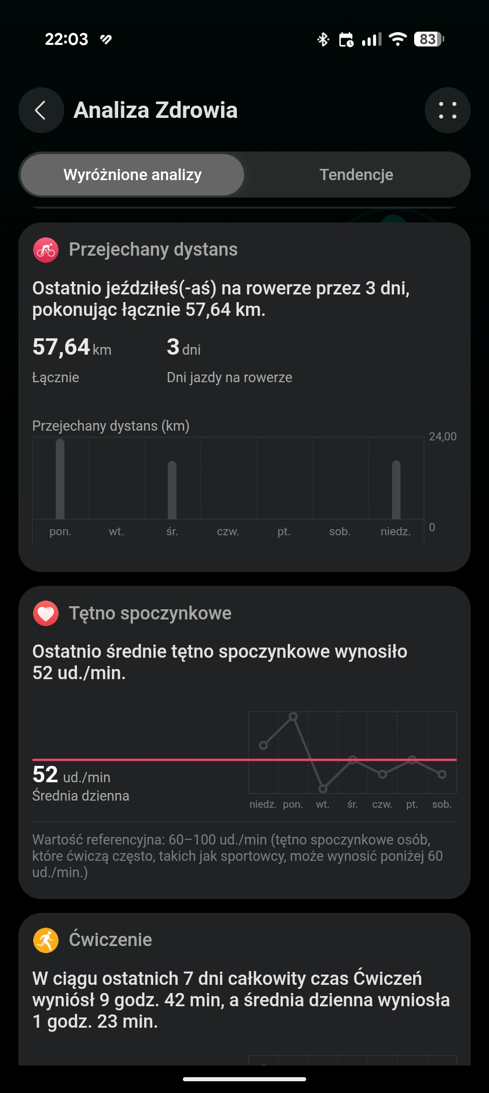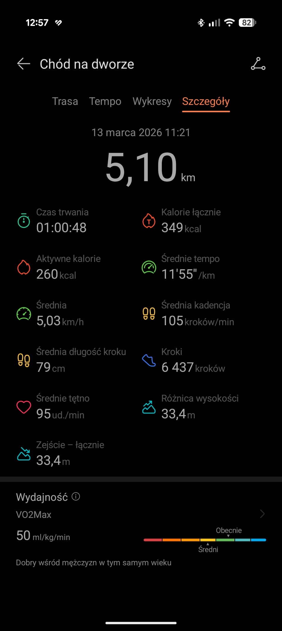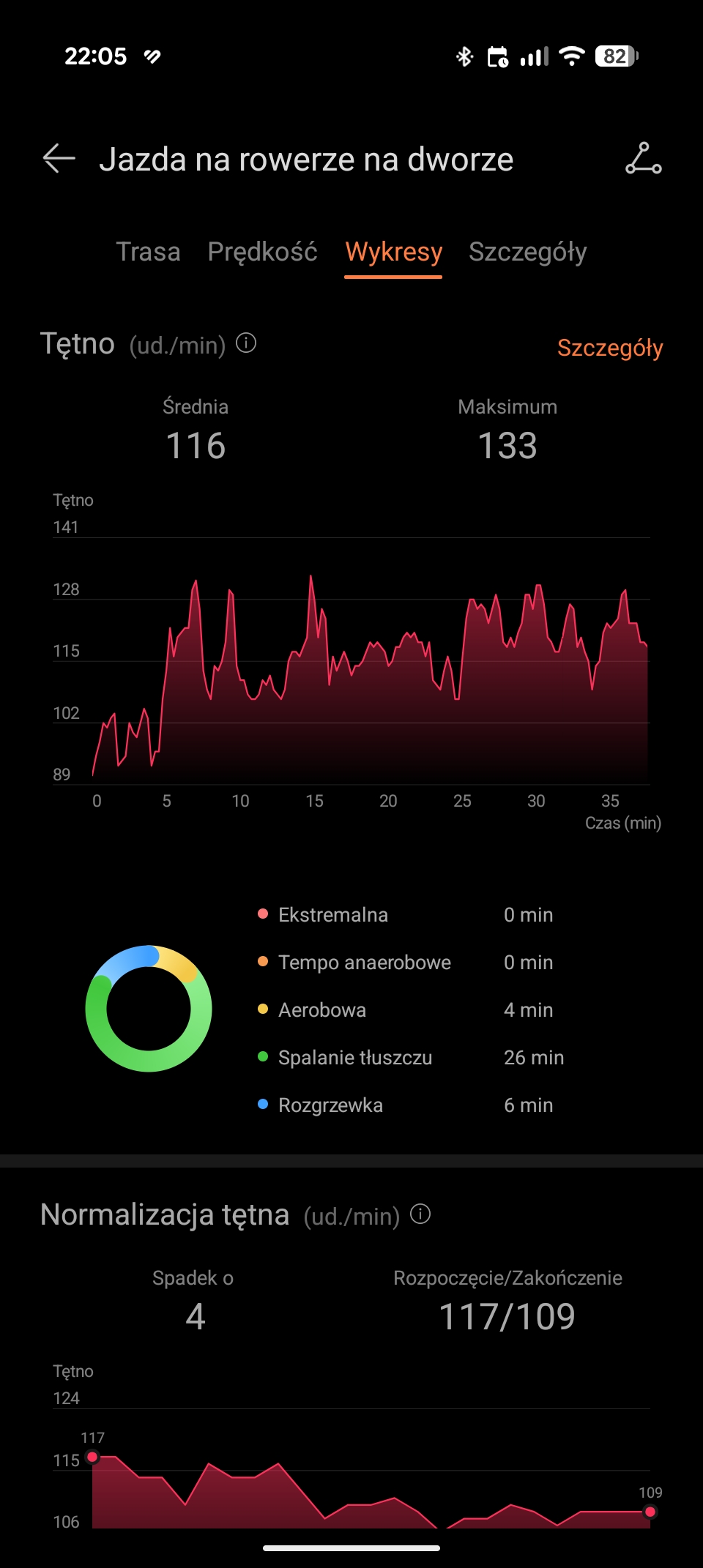 Zdaję sobie sprawę, że ostatnie dwie wirtualne wartości należy traktować w formie ciekawostki. Zaskoczyło mnie jednak, że na odcinkach, gdy moje nogi odpoczywały (np. zjazd z górki), smartwatch pokazywał, że aktualna kadencja wynosi zero. Natomiast, prawie od razu po rozpoczęciu pedałowania, kadencja rosła.