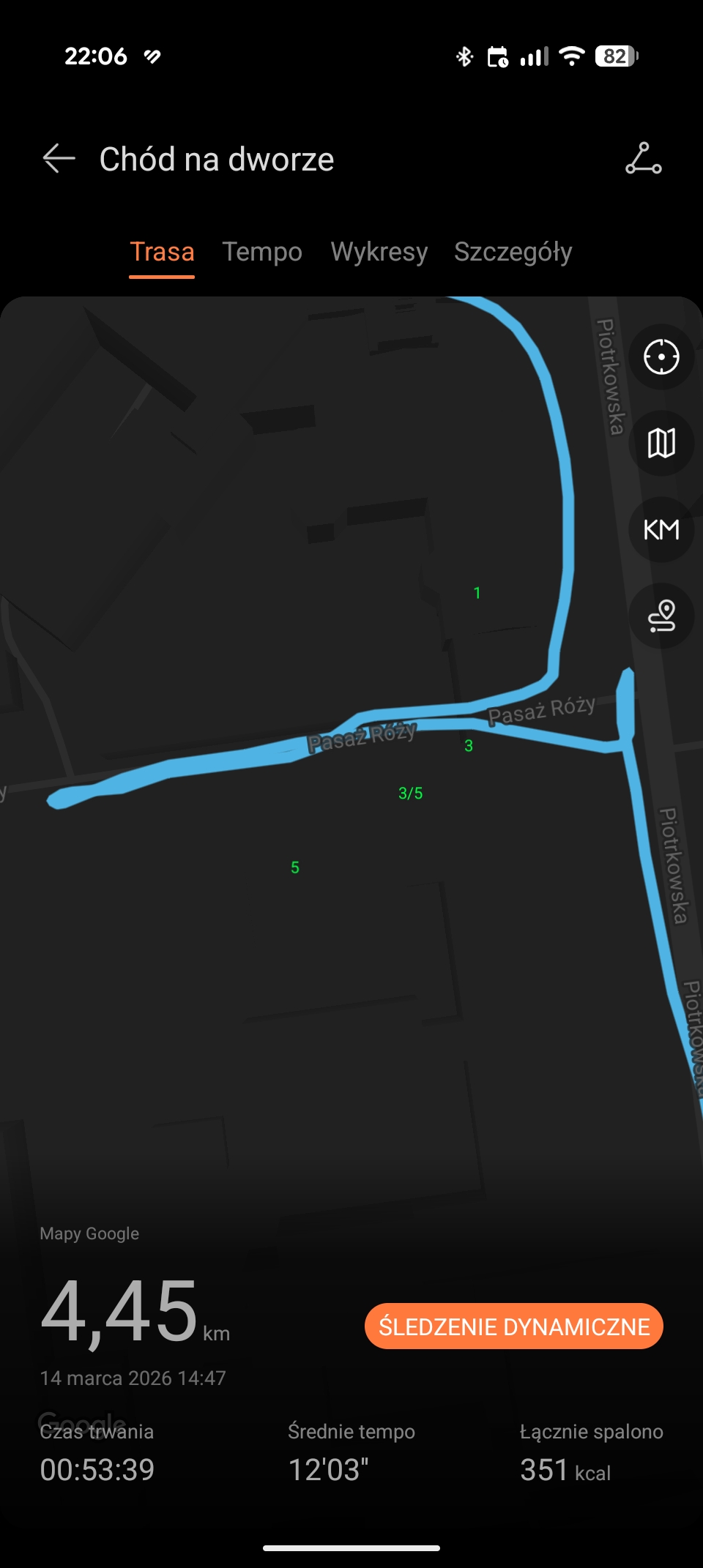 W sportowym smartwatchu – oprócz czujnika tętna – ważny jest też GPS. Huawei Watch GT Runner 2 na tym polu oferuje dwuzakresowy GPS, a także nową architekturę anteny o nazwie 3D Floating Antenna. Jak to wszystko działa? Po prostu świetnie. U mnie na wsi sygnał GPS łapany jest dosłownie po chwili, a w mieście po maksymalnie kilku sekundach. Natomiast ślad zapisywany jest precyzyjnie i smartwatch nie gubi się, gdy trzeba przykładowo przejść przez bramę w łódzkiej kamienicy, aby móc obejrzeć Pasaż Róży.