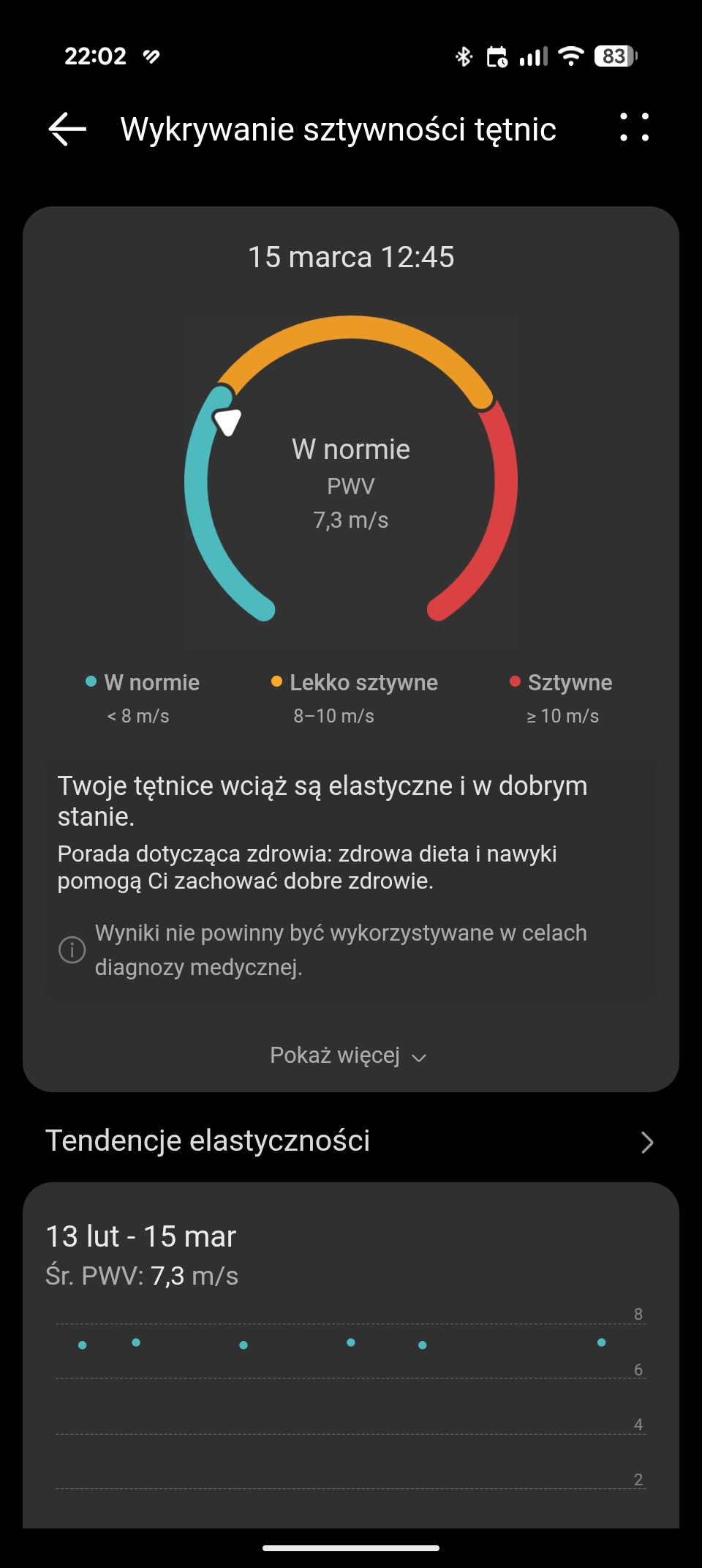 Zegarek zbiera jeszcze dane dotyczące pulsu w ciągu całego dnia (pomiar ciągły lub inteligentny), stresu, temperatury skóry, mierzy poziom natlenienia krwi, HRV w trakcie odpoczynku i snu, ma pomiar EKG i może wykrywać prawdopodobne migotanie przedsionków oraz ma funkcję badania sztywności tętnic. Zgromadzone dane mogą być przedstawiane w formie trendów, co pozwala szybko zauważyć ewentualne odchylenia.