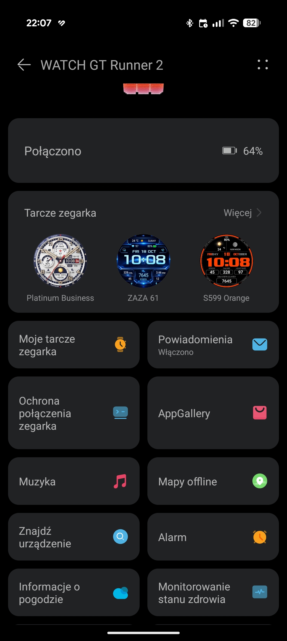 Dostępnych jest sporo tarcz – kilka znajdziemy na zegarku, kilkadziesiąt pozostałych stworzonych przez Huawei można wgrać z poziomu aplikacji Huawei Zdrowie. Do tego dochodzi długa lista tarcz stworzonych przez zewnętrznych twórców – w sklepie są tarcze darmowe oraz te, które wymagają wyciągnięcia z portfela kilku lub kilkunastu złotych. Wiele tarcz można spersonalizować – nawet te zaprojektowane dla biegaczy skonfigurujemy tak, aby wyświetlały bardziej podstawowe dane, jak puls czy liczba wykonanych kroków.