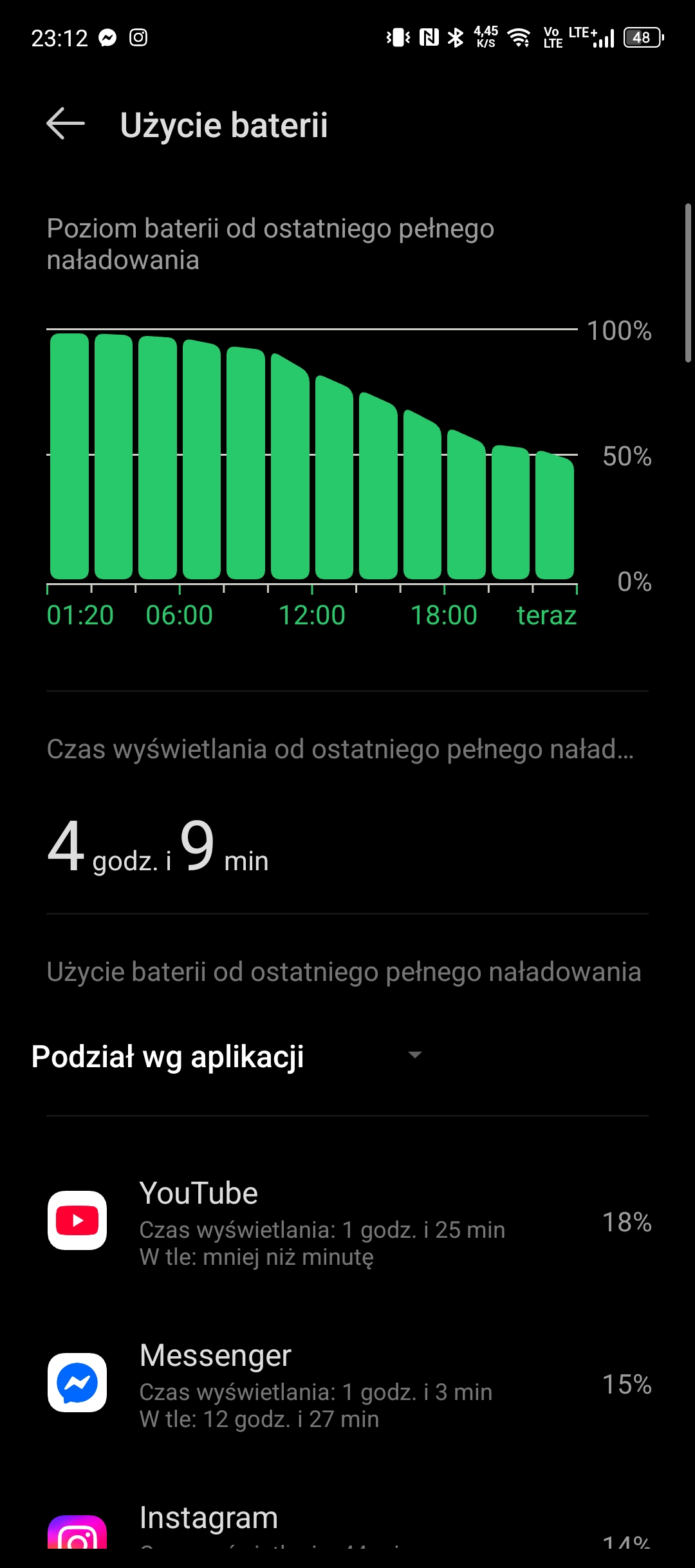 Wedle moich testów, w trybie Hyper, pierwsze 50% naładowania pojawia się po upływie 27 minut, a na pełne naładowanie potrzebne jest już 70 minut. Natomiast, gdy korzystałem z trybu inteligentnego, uzyskanie 50% zajmowało 39 minut, a do 100% Infinix Hot 50 Pro+ ładował się wówczas w 78 minut.