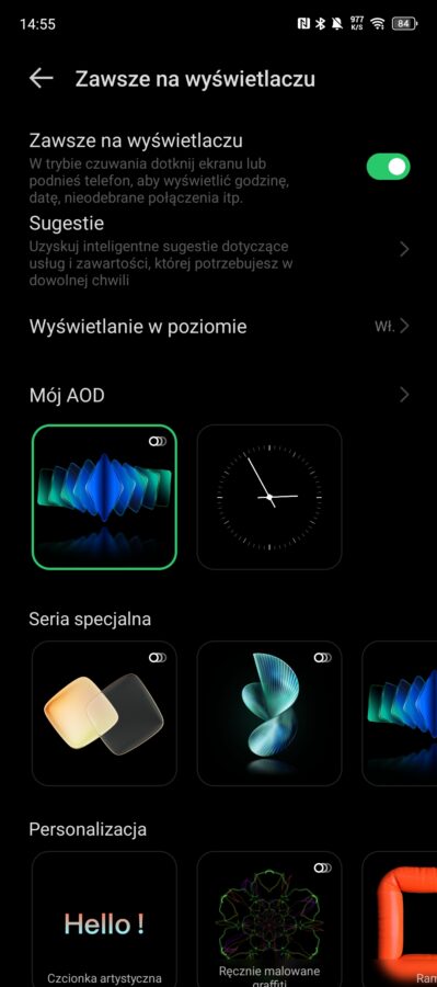 Na pokładzie jest też Always On Display, tutaj nazwane jako Zawsze na wyświetlaczu, choć – niestety – wcale nie jest ono pokazywane zawsze, a tylko przez 10 sekund po dotknięciu ekranu lub podniesieniu telefonu. Trochę szkoda.