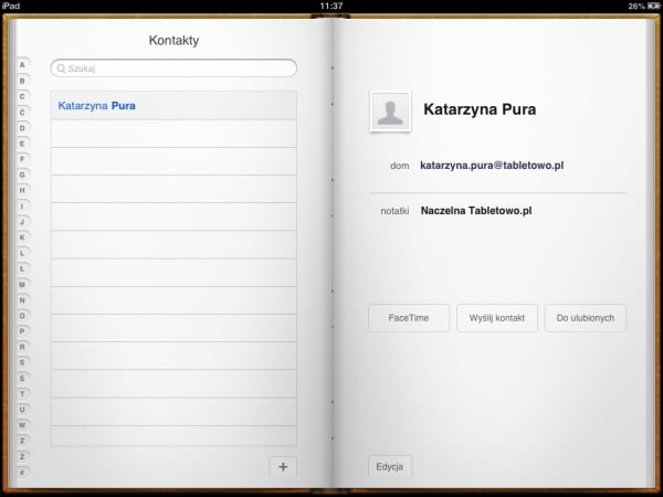Skoro już o pisaniu i klawiaturze wirtualnej mowa… Podobnie jak w przypadku iPada trzeciej generacji, także i tu klawiatura może być „zadokowana” (umiejscowiona na dole ekranu), jak i „oddokowana” (po środku ekranu). Mamy także możliwość ustawienia klawiatury na całą szerokość wyświetlacza, a jeśli zachodzi taka potrzeba, w każdej chwili można podzielić ją na dwie mniejsze – do wygodniejszego pisania kciukami (i tu należy nadmienić, że istnieją ukryte przyciski obok liter najdalej wysuniętych od ramki ekranu – przy: t, g, v, y, h, b, o czym możecie przeczytać w tym wpisie). Ustawienia te można zmieniać dłużej przytrzymując ikonkę odpowiedzialną za chowanie klawiatury (prawy dolny róg ekranu) lub za pomocą gestów – by podzielić klawiaturę wystarczy przesunąć po niej dwoma palcami w przeciwne strony (tj. lewym w lewo, prawym w prawo). Oczywiście nie należy również zapomnieć o wprowadzaniu polskich znaków za pomocą muśnięcia danej literki (o, a, e i pozostałych) od góry.