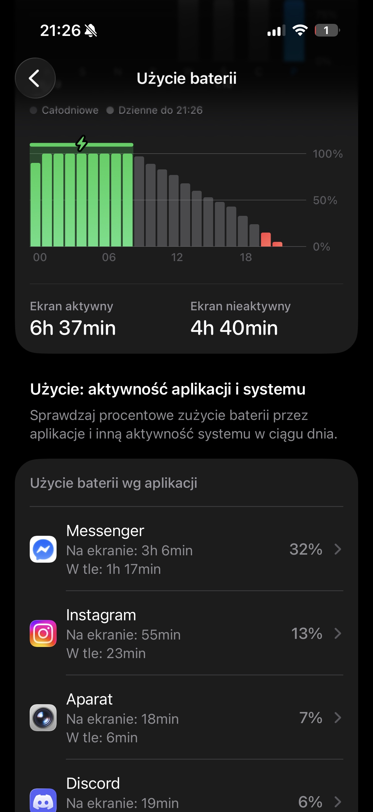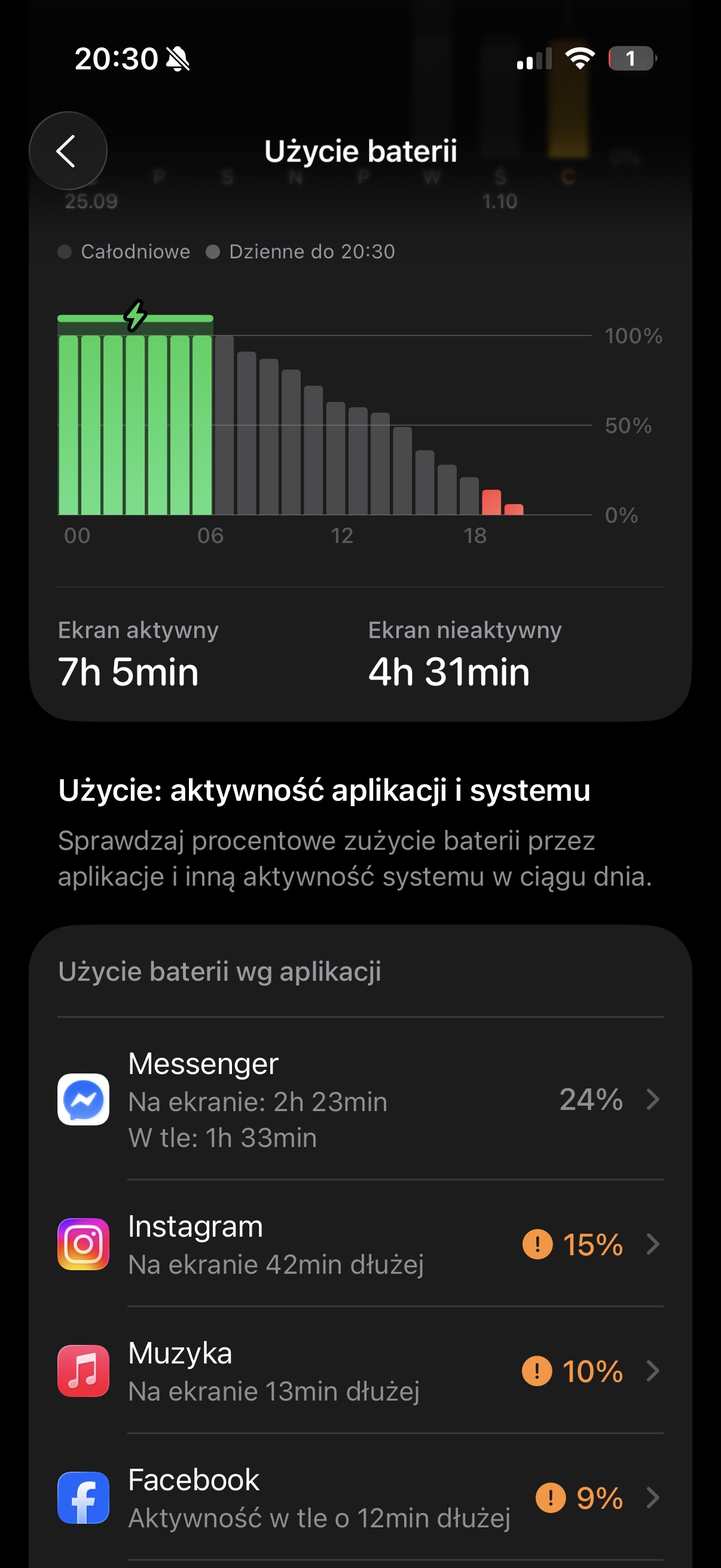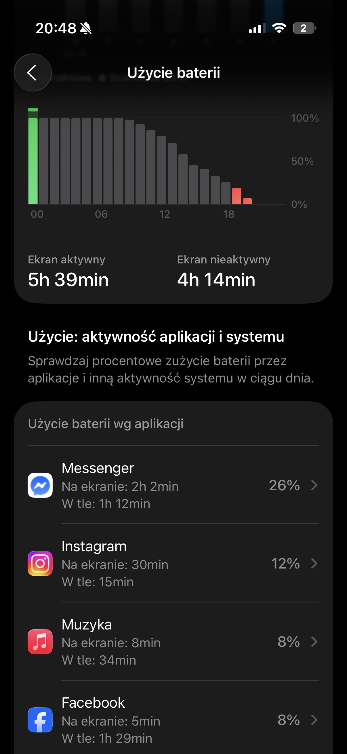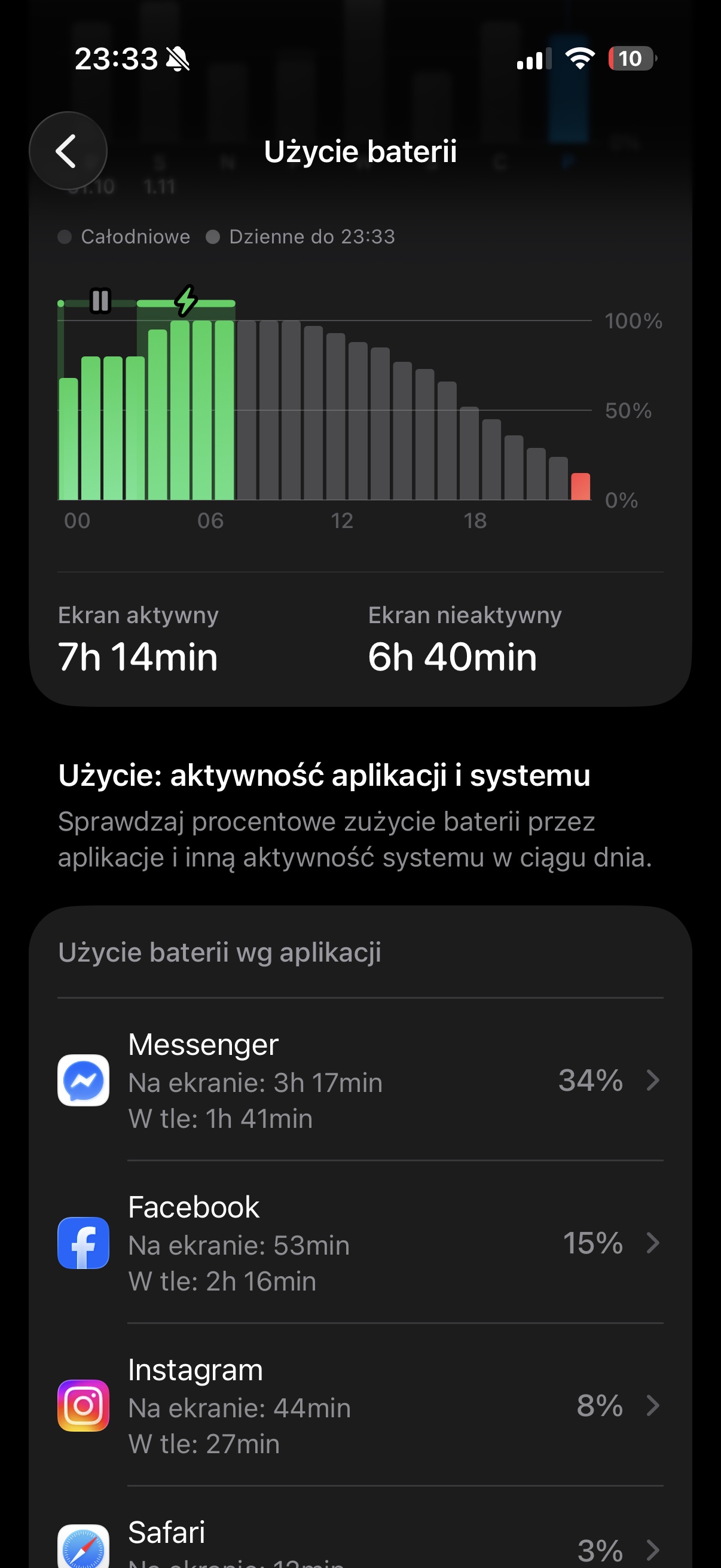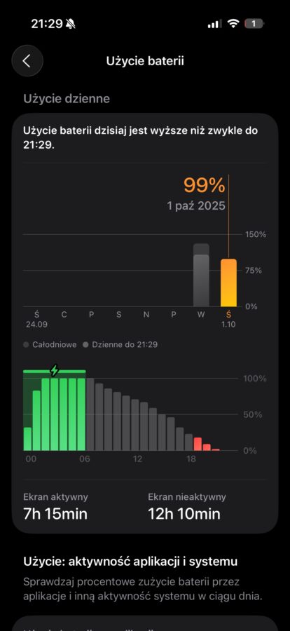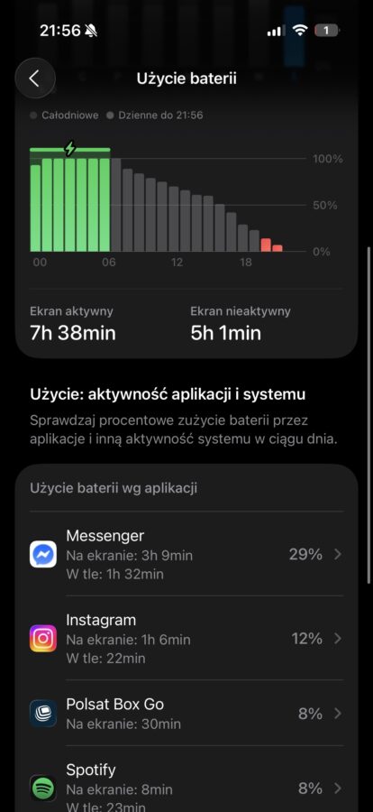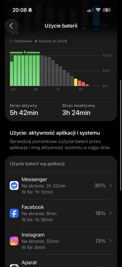 iOS nie jest zbyt pomocny w liczeniu czasu włączonego ekranu, bo statystyki te – po pierwsze – rozjeżdżają się lekko z danymi z raportu czas przed ekranem, a po drugie, resetują się o północy, zamiast wraz z końcem cyklu baterii. Niemniej jednak, korzystając prawie stuprocentowo z WiFi, mogłem liczyć na SoT wynoszący do 7-7,5 h, w trybie mieszanym było to około 6,5 h, a przy przeważającym użyciu 5G absolutnym maksem było 5 h.