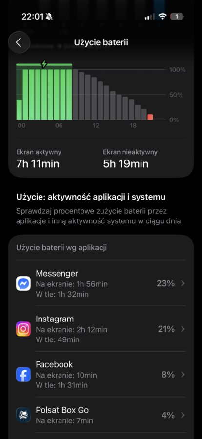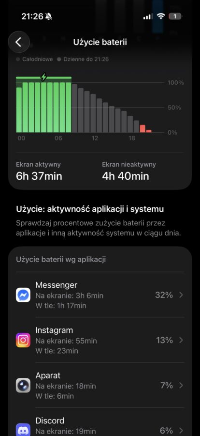 Już na wstępie musicie wiedzieć, że nie jest to smartfon, który potrafi wytrzymać więcej niż jeden dzień bez ładowania, bo sporo baterii traci leżąc bezczynnie. Przykładowo – w dniu, w którym sięgałem po niego naprawdę sporadycznie (około 2,5 h na włączonym ekranie), o północy i tak miał już tylko 37%, co nijak nie wystarczyłoby na pociągnięcie użytkowania następnego dnia.