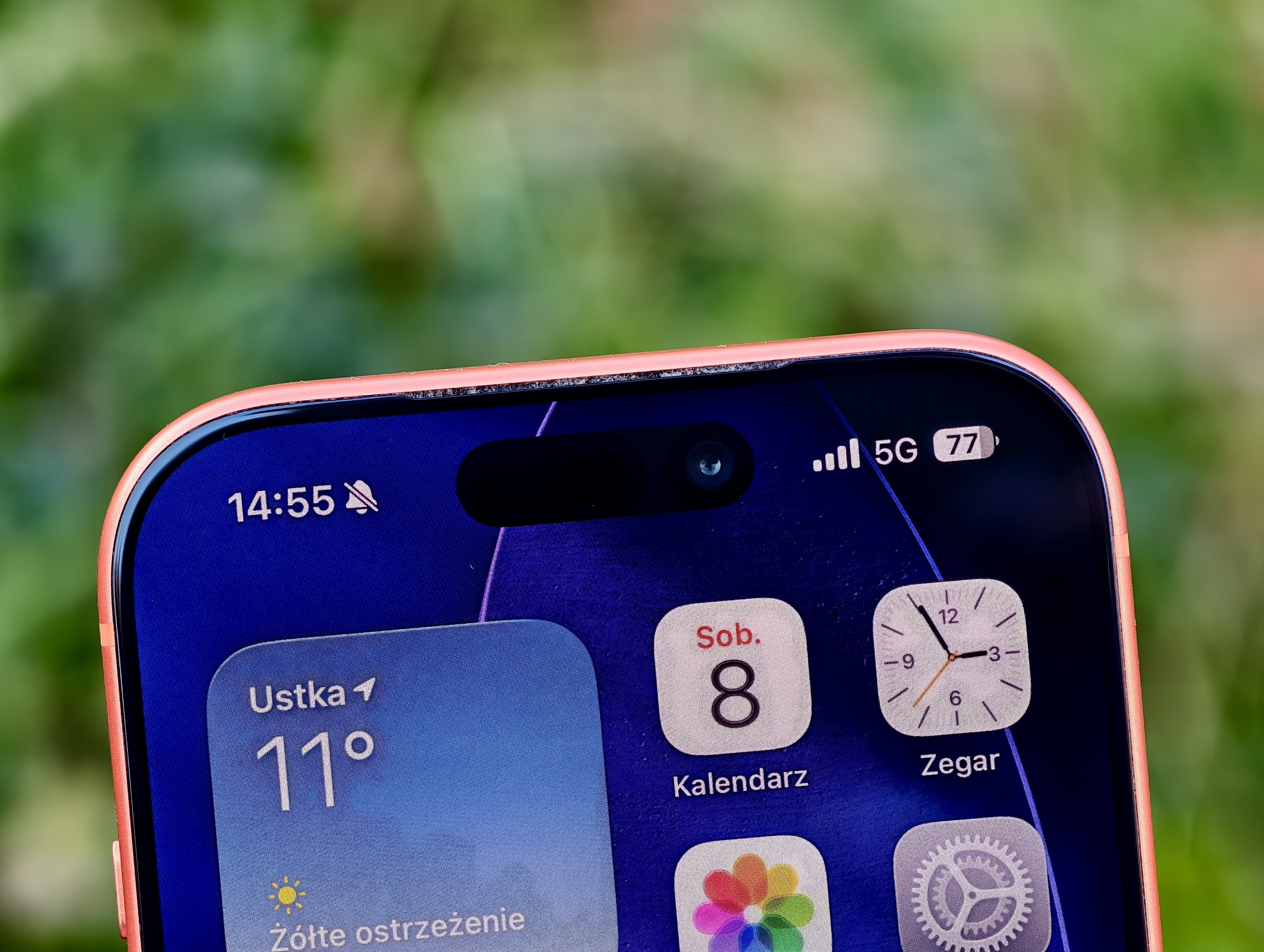 Wyświetlacz pokryty jest płaskim szkłem z warstwą Ceramic Shield 2, która ma być jeszcze bardziej odporna na zarysowania i pęknięcia. Ostatniego wolałem nie sprawdzać intencjonalnie, natomiast po około półtora miesiąca testów nie dostrzegam na ekranie żadnych widocznych, głębszych rys. Zresztą, tyczy się to również plecków i korpusu.