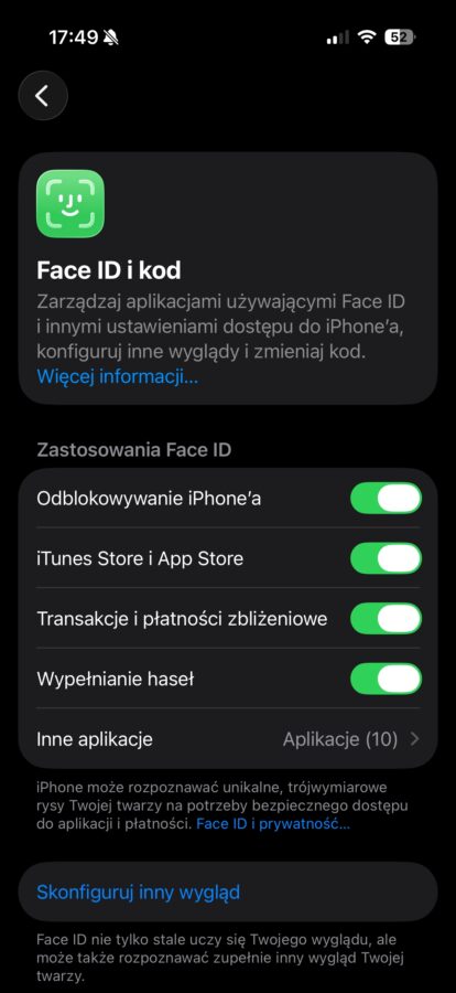 W przeciwieństwie do ogromnej większości producentów, Apple już od ośmiu lat (konkretniej od iPhone’a X) praktycznie całkowicie zrezygnowało z implementacji czytników linii papilarnych w swoich smartfonach. Zamiast tego, główną (i jedyną) formą zabezpieczenia biometrycznego, jest rozpoznawanie twarzy Face ID.
