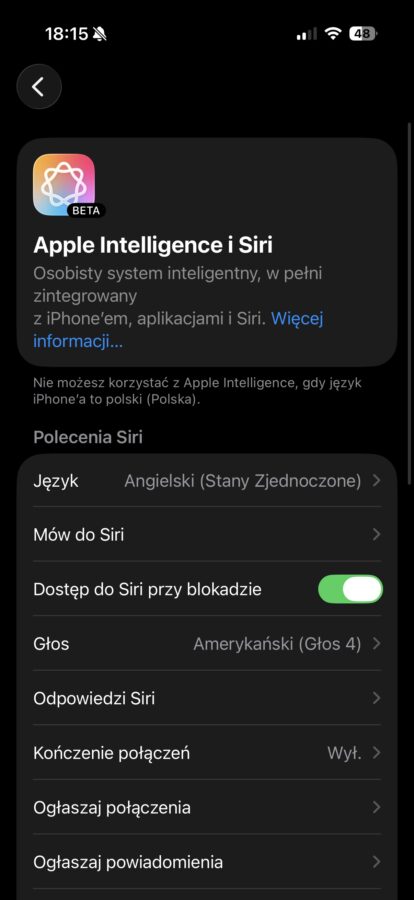 Niestety, w dalszym ciągu nie możemy korzystać z funkcji Apple Intelligence w języku polskim. Co prawda można je włączyć, ale tylko po przestawieniu języka telefonu na angielski. W efekcie, Apple pozostaje na tym polu całkowicie w tyle za innymi firmami, których smartfony oferują rozwiązania AI, działające w naszym języku.
