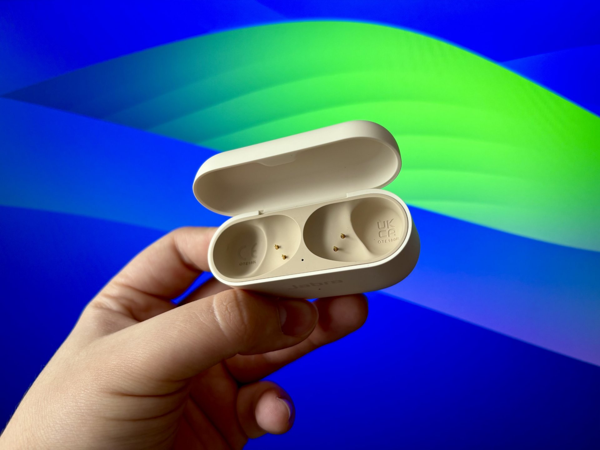 Na froncie nadrukowano logo Jabra, a tuż pod nim znalazła się jedna z diód LED informująca nas o poziomie naładowania etui. Od spodu ulokowano złącze USB-C, a wewnątrz, między gniazdami na słuchawki, znalazła się druga dioda – ta z kolei daje znać czy same pchełki są naładowane.