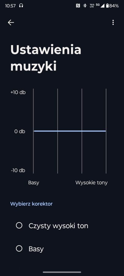 Niżej znalazło się kilka predefiniowanych ustawień brzmienia, żywcem zaczerpniętych z apki Dolby Atmos, takich jak inteligentny, muzyka, film, gra itd. oraz możliwość dostosowania ich dodatkowymi czterema presetami EQ. Wybierając opcję Niestandardowy zyskujemy z kolei dostęp do pełnowymiarowego, 10-zakresowego korektora.